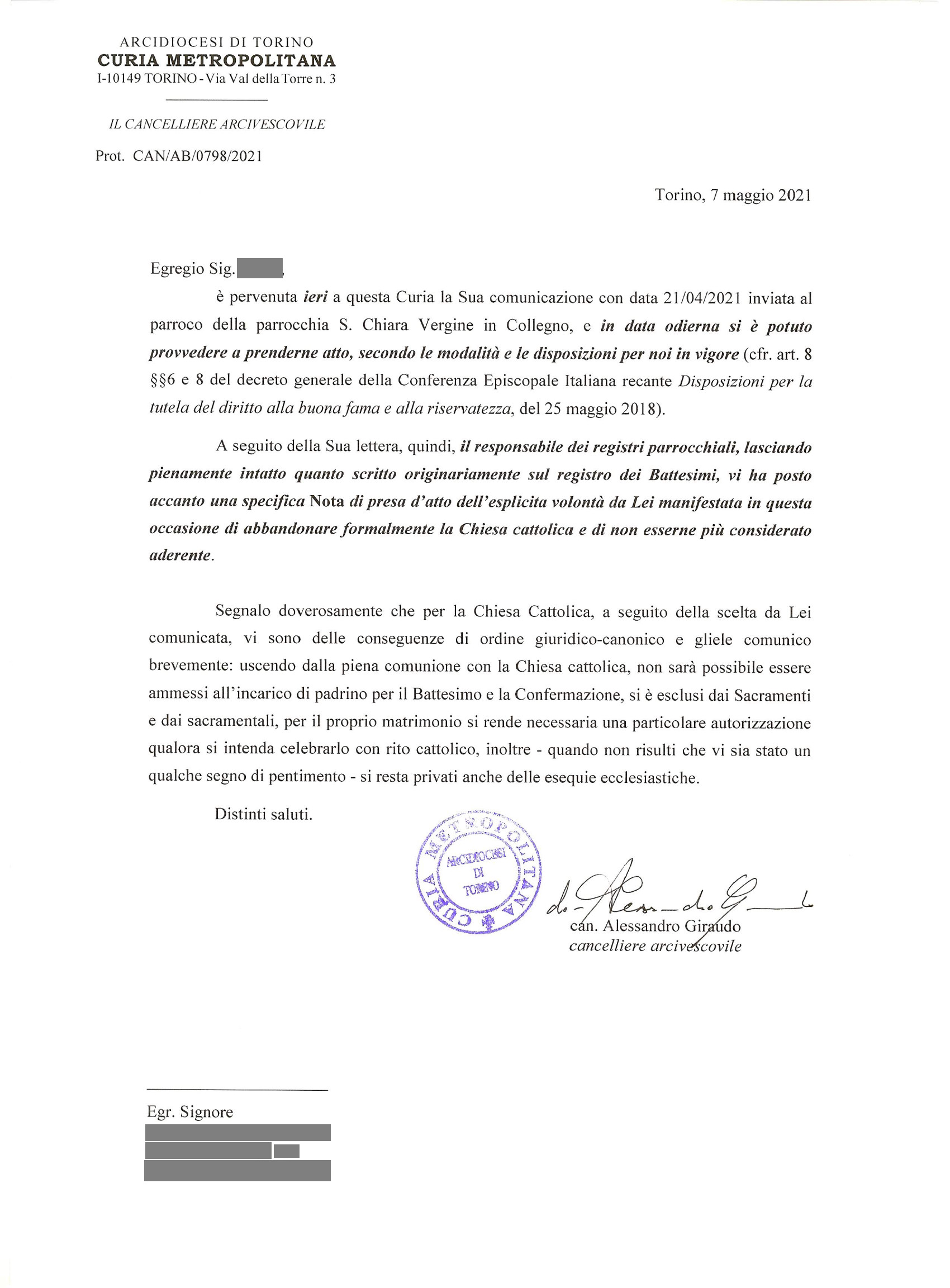 Una persona ha chiesto la rettifica dei dati relativi al proprio battesimo avvenuto a S. Chiara Vergine - COLLEGNO (TO) il 07/05/2021, dichiarando di non voler più far parte della Chiesa Cattolica.