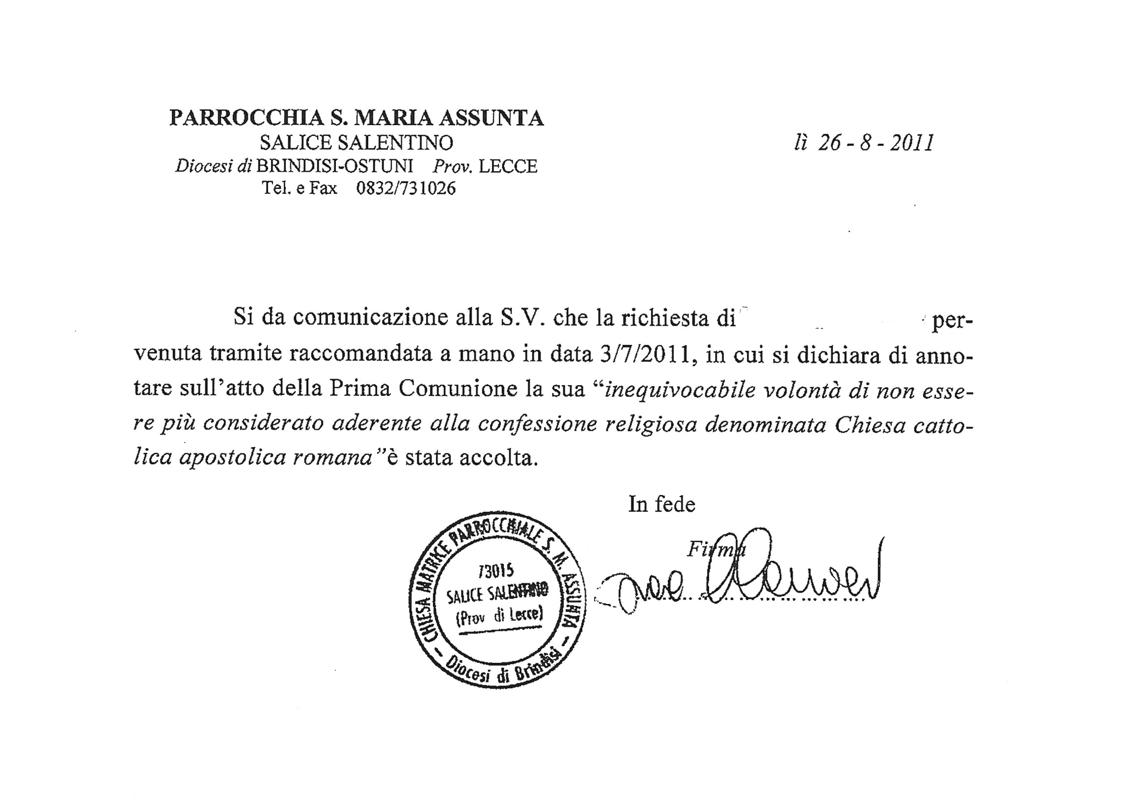 Una persona ha chiesto la rettifica dei dati relativi al proprio battesimo avvenuto a Santa Maria Assunta - SALICE SALENTINO (LE) il 26/08/2011, dichiarando di non voler più far parte della Chiesa Cattolica.