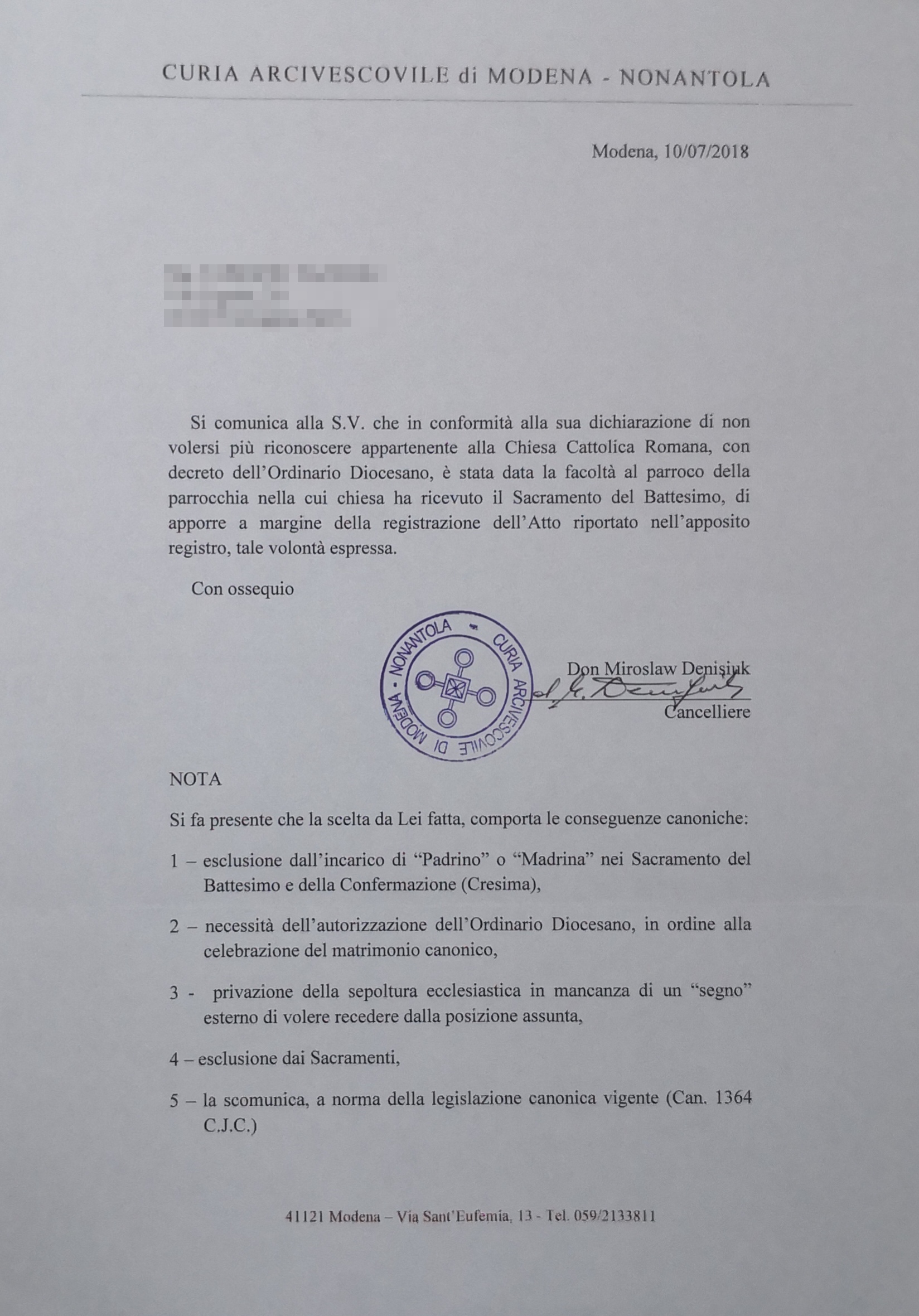 Una persona ha chiesto la rettifica dei dati relativi al proprio battesimo avvenuto a San Bartolomeo Apostolo - FORMIGINE (MO) il 10/07/2018, dichiarando di non voler più far parte della Chiesa Cattolica.