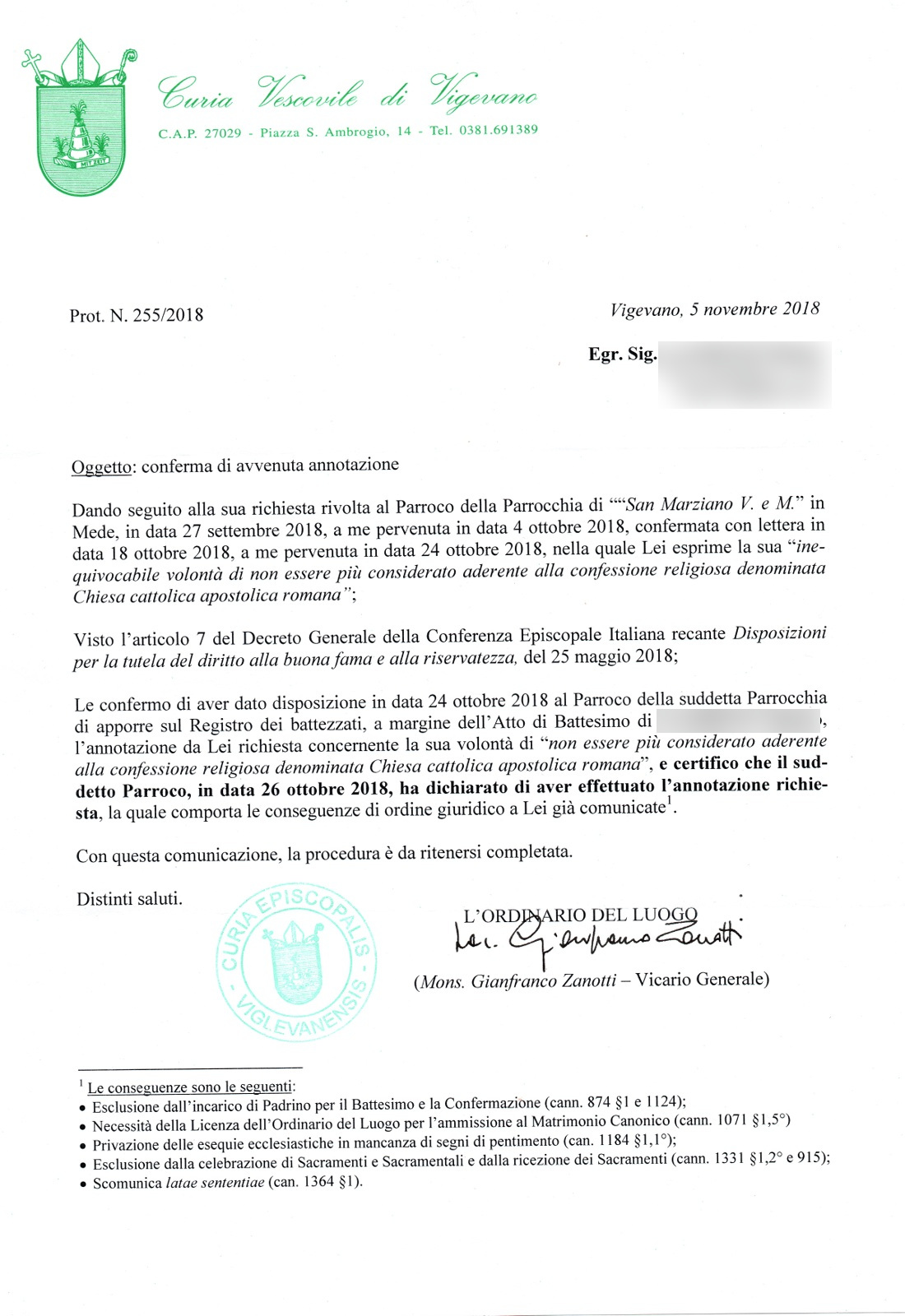 Una persona ha chiesto la rettifica dei dati relativi al proprio battesimo avvenuto a S. Marziano Vescovo e Martire - MEDE (PV) il 26/10/2018, dichiarando di non voler più far parte della Chiesa Cattolica.