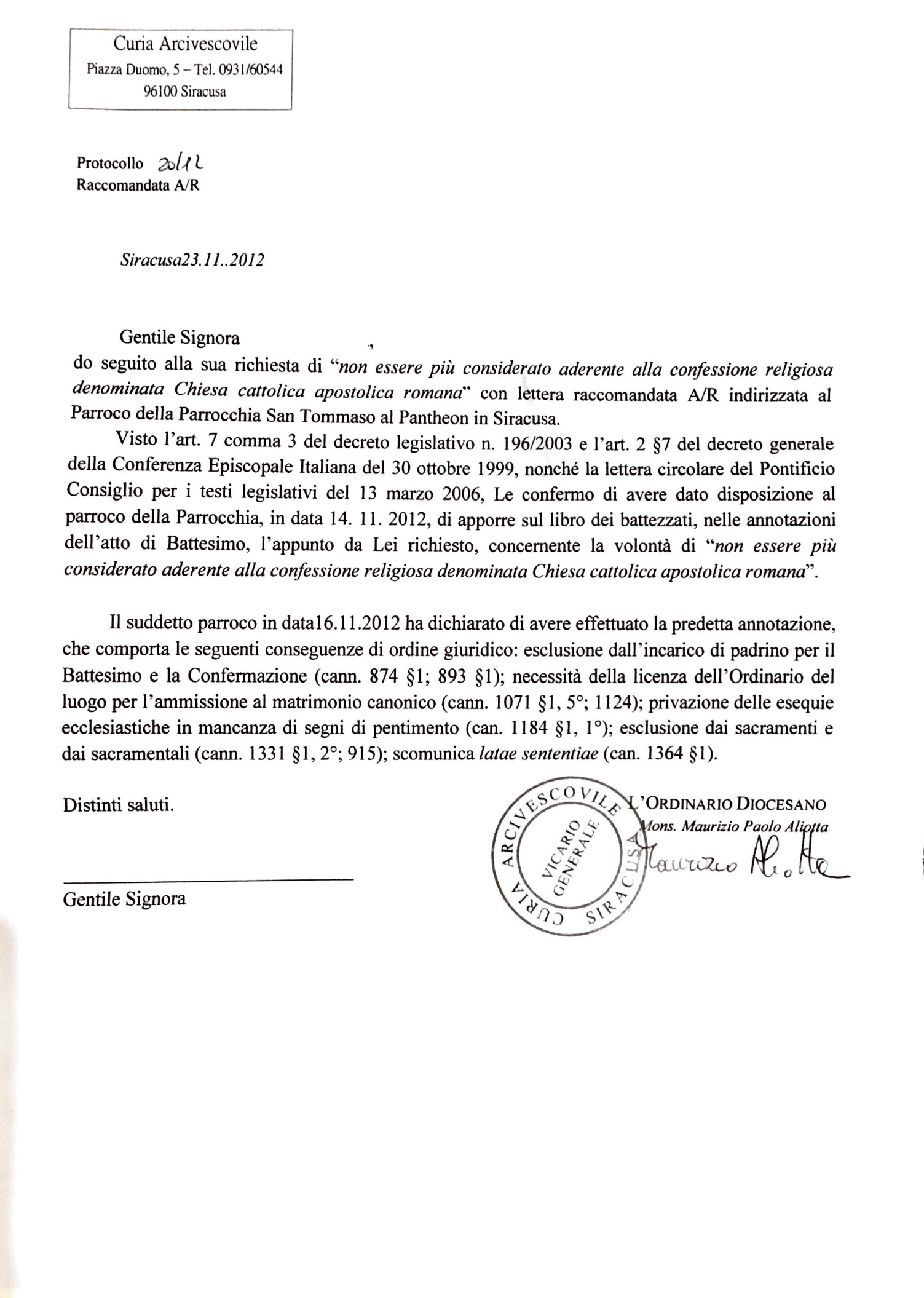 Una persona ha chiesto la rettifica dei dati relativi al proprio battesimo avvenuto a S. Tommaso Apostolo al Pantheon - SIRACUSA (SR) il 16/11/2012, dichiarando di non voler più far parte della Chiesa Cattolica.