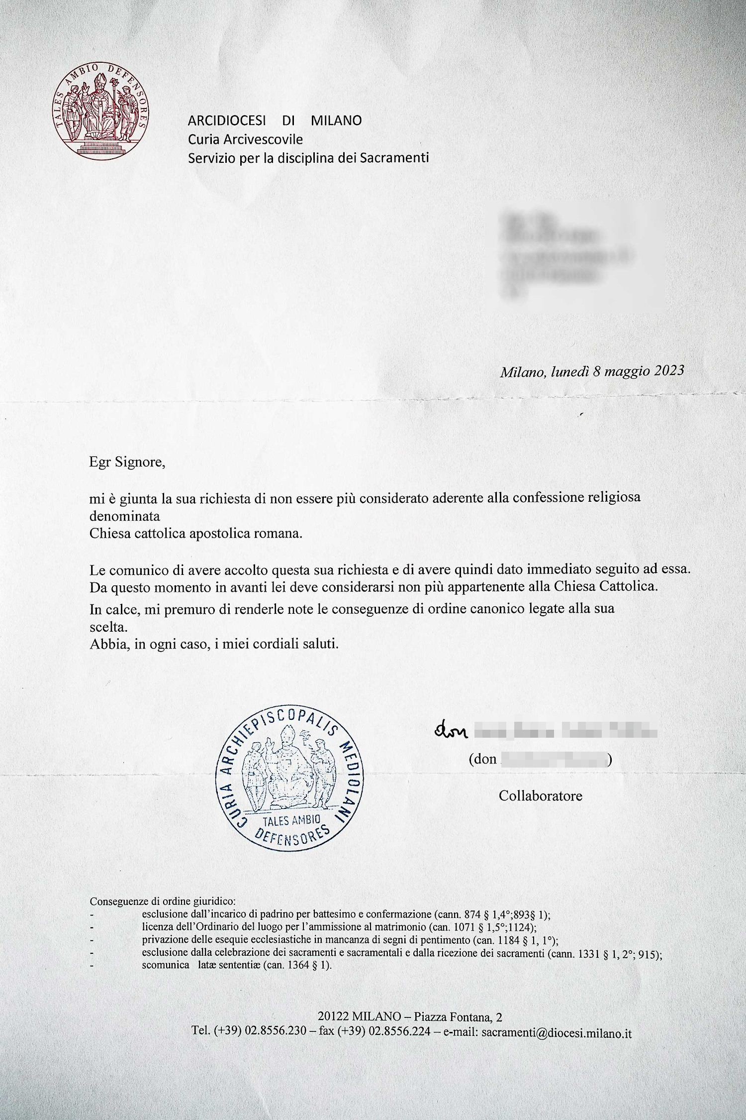 Ho utilizzato il modulo proposto da UAAR e la risposta è arrivata in fretta. Interessante la formula di saluto "Abbia, in ogni caso, i miei più cordiali saluti". Ora dobbiamo procedere con lo sbattezzo dalla Svizzera per mia moglie.