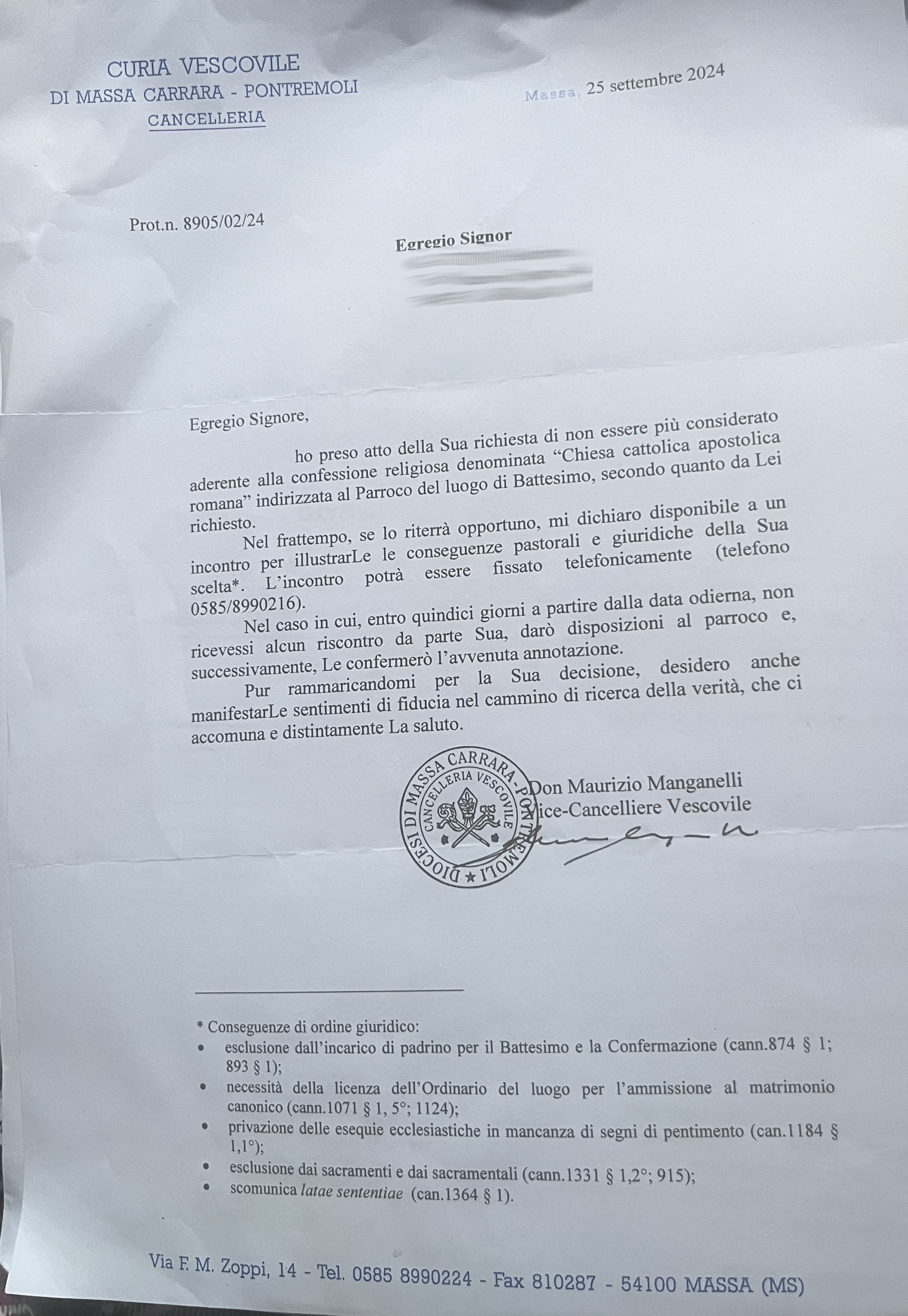 Una persona ha chiesto la rettifica dei dati relativi al proprio battesimo avvenuto a S. Andrea Apostolo - CARRARA (MS) il 25/09/2024, dichiarando di non voler più far parte della Chiesa Cattolica.