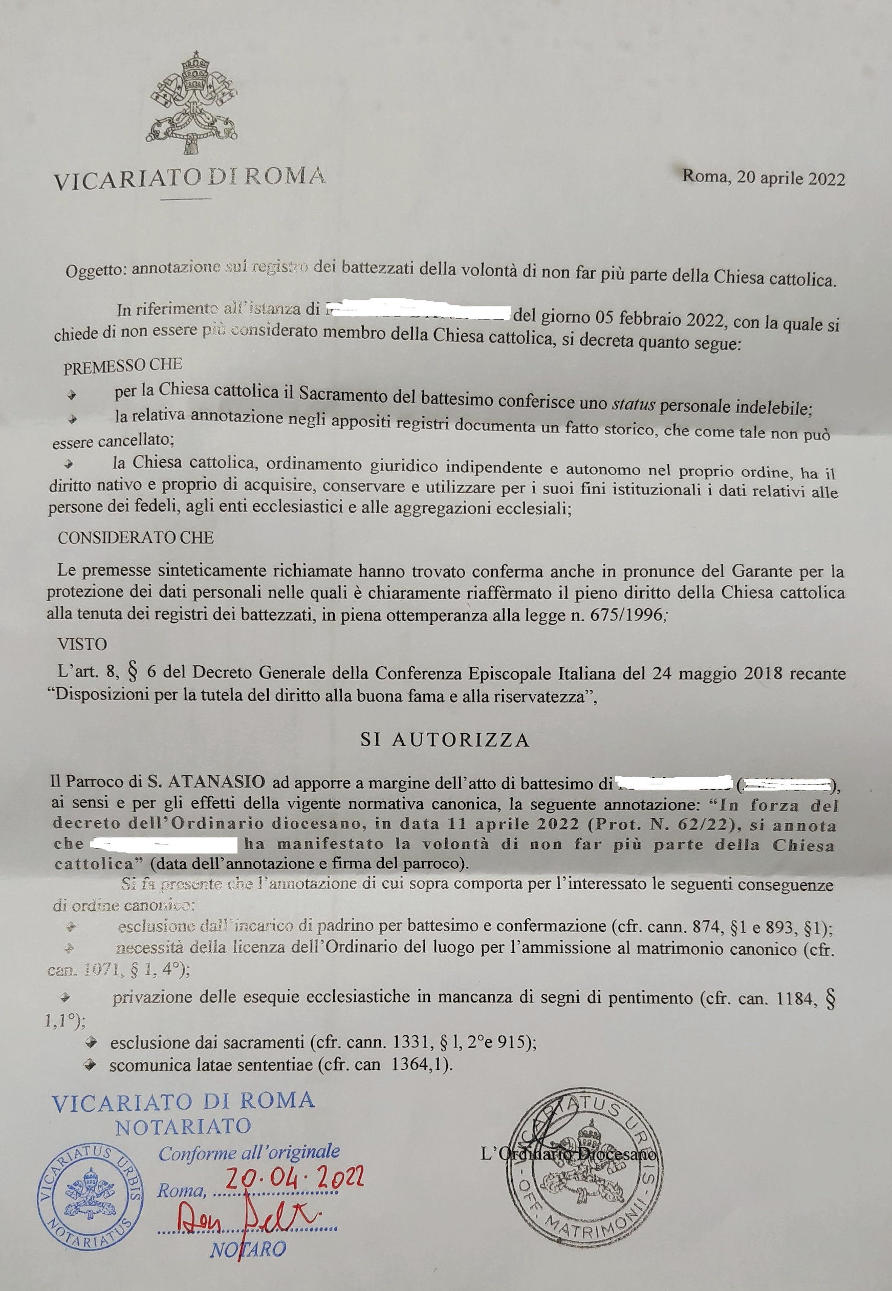Una persona ha chiesto la rettifica dei dati relativi al proprio battesimo avvenuto a S. Atanasio - ROMA (RM) il 26/04/2022, dichiarando di non voler più far parte della Chiesa Cattolica.