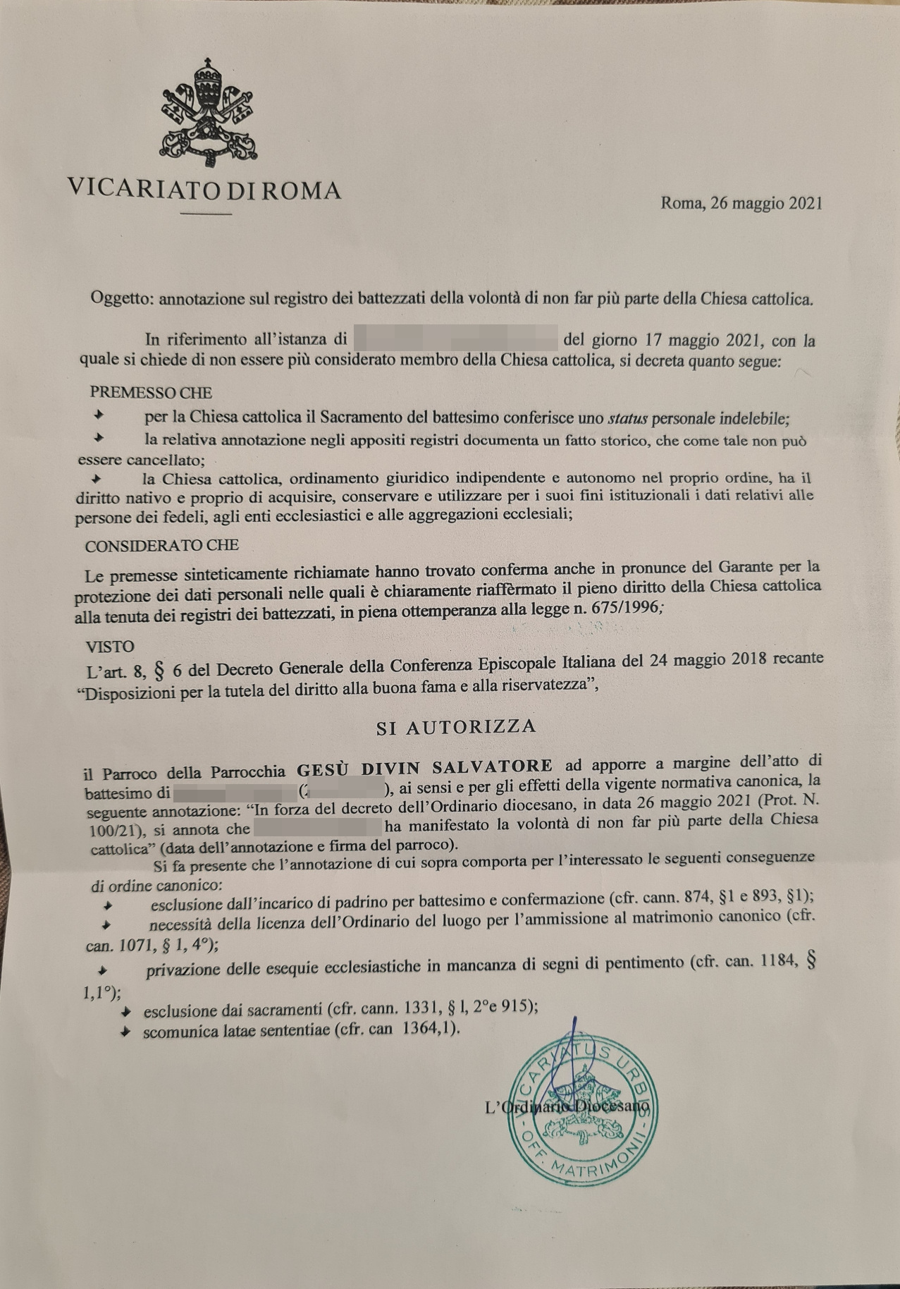 Una persona ha chiesto la rettifica dei dati relativi al proprio battesimo avvenuto a Gesù Divin Salvatore - ROMA (RM) il 26/05/2021, dichiarando di non voler più far parte della Chiesa Cattolica.