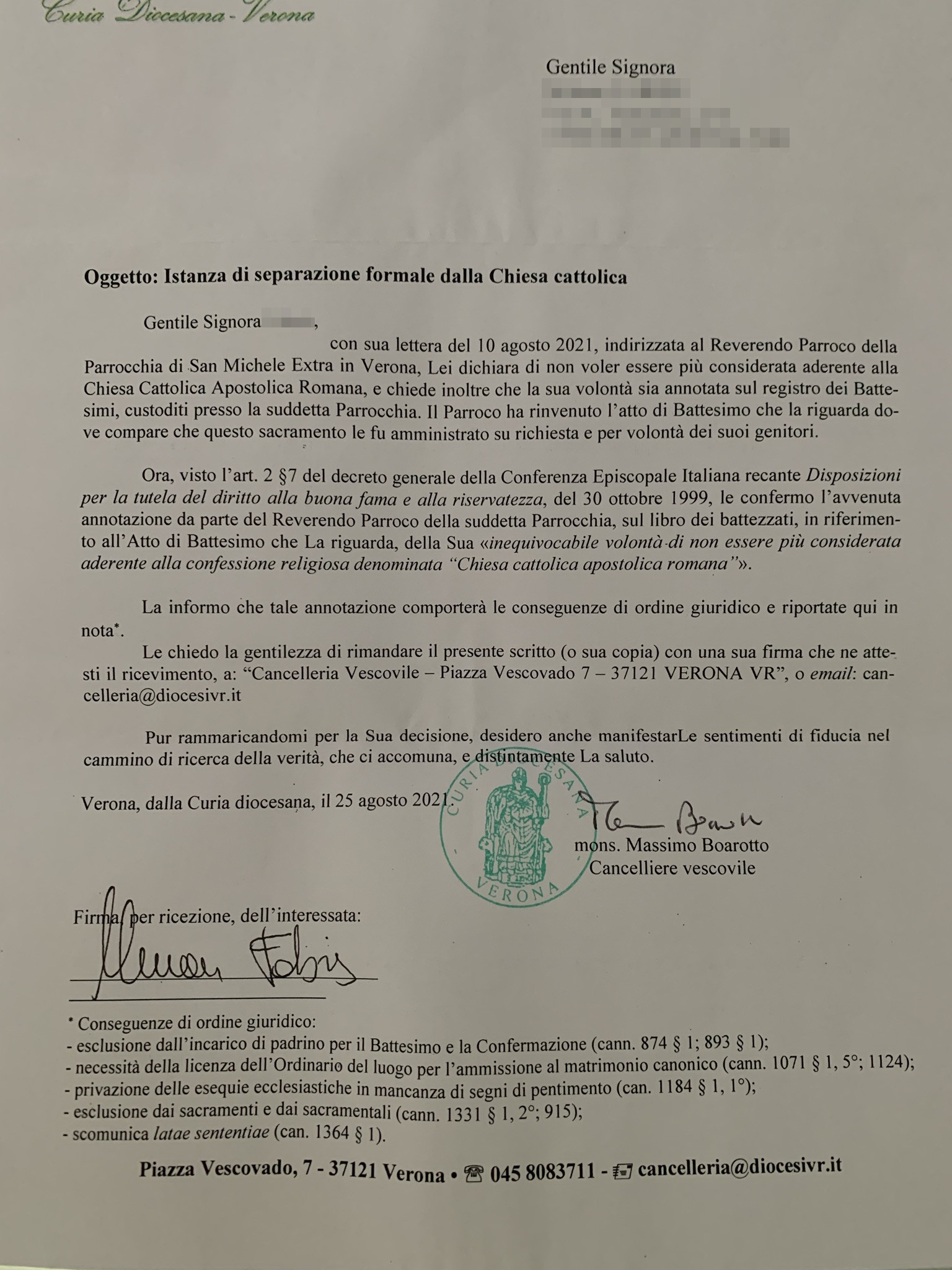 Una persona ha chiesto la rettifica dei dati relativi al proprio battesimo avvenuto a S. Michele Arcangelo - VERONA (VR) il 31/08/2021, dichiarando di non voler più far parte della Chiesa Cattolica.