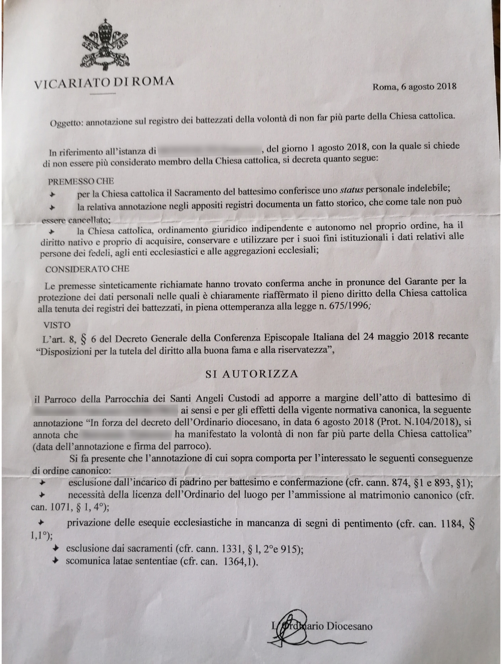 Una persona ha chiesto la rettifica dei dati relativi al proprio battesimo avvenuto a Santi Angeli Custodi - ROMA (RM) il 06/08/2018, dichiarando di non voler più far parte della Chiesa Cattolica.