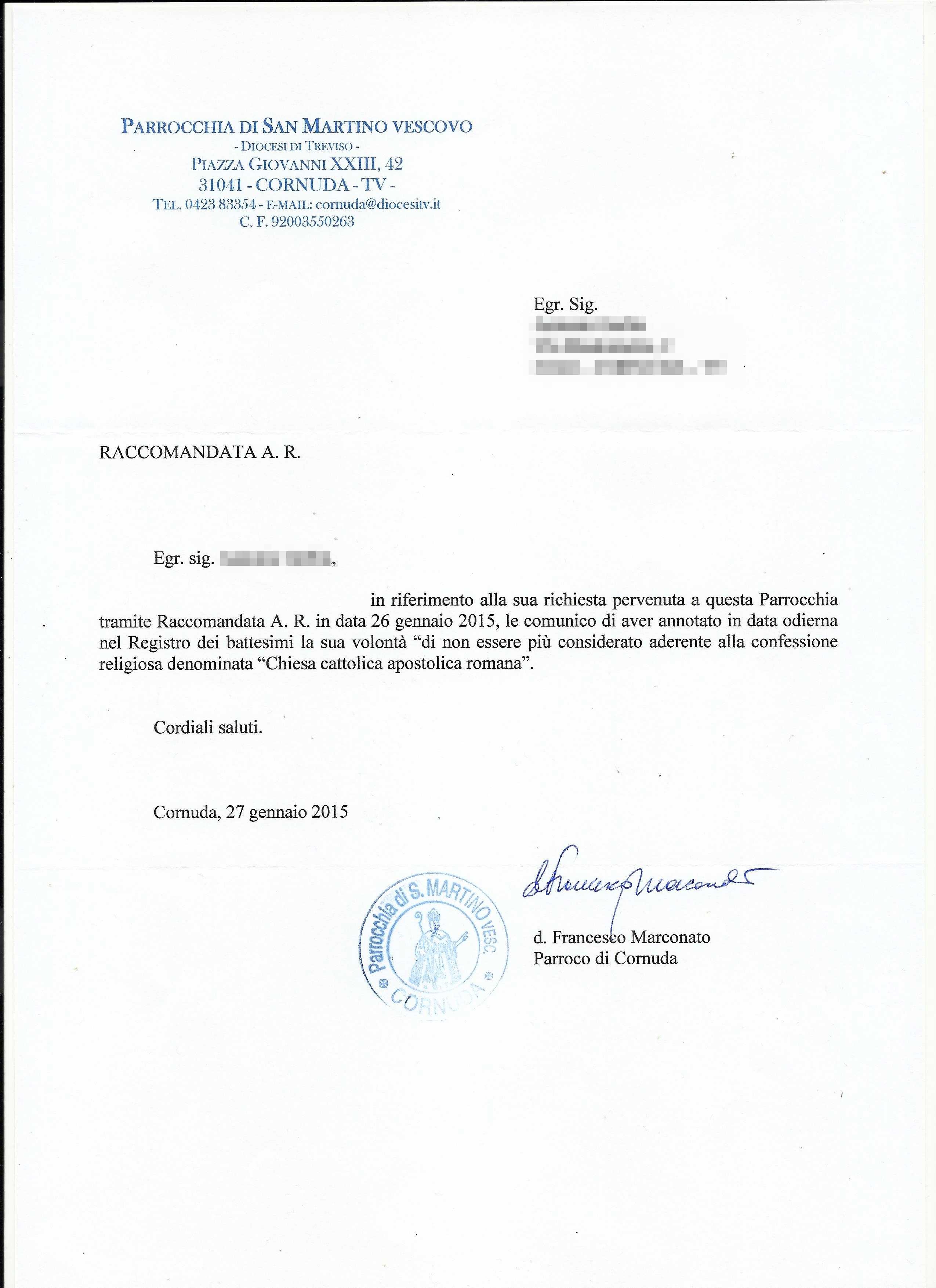 Una persona ha chiesto la rettifica dei dati relativi al proprio battesimo avvenuto a San Martino Vescovo - CORNUDA (TV) il 26/01/2015, dichiarando di non voler più far parte della Chiesa Cattolica.