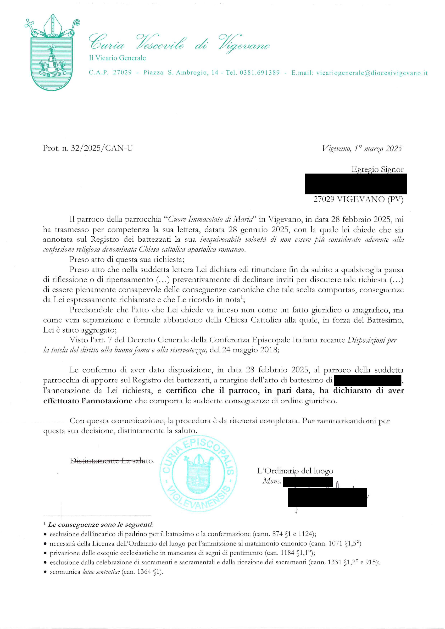 Una persona ha chiesto la rettifica dei dati relativi al proprio battesimo avvenuto a Cuore Immacolato di Maria - VIGEVANO (PV) il 01/03/2025, dichiarando di non voler più far parte della Chiesa Cattolica.