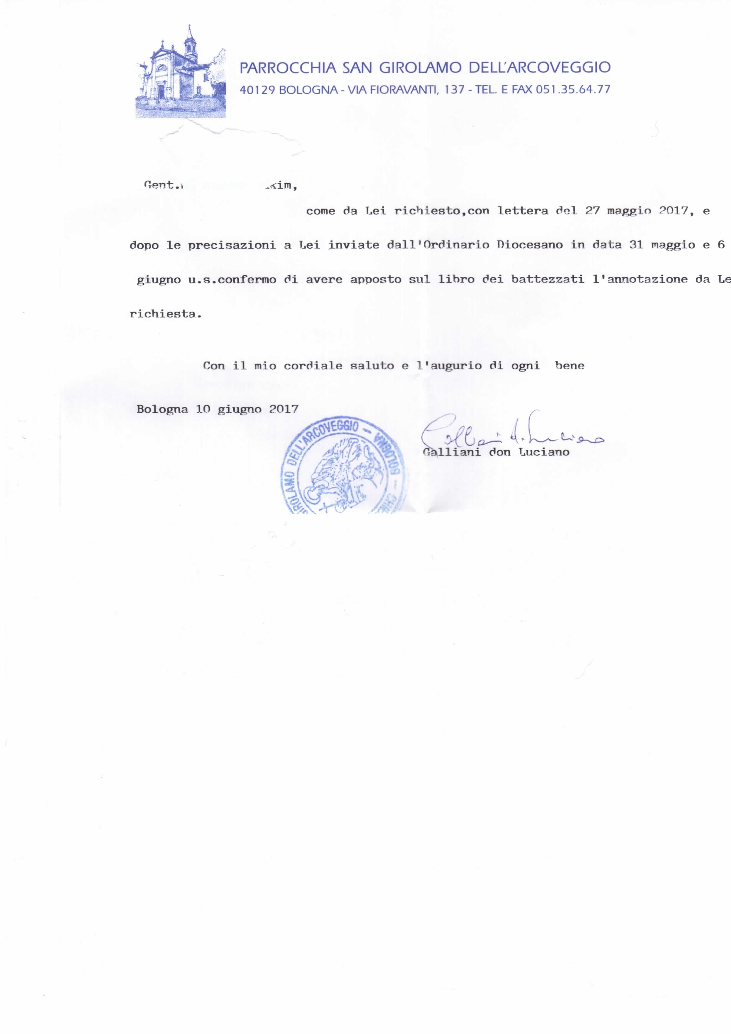 Una persona ha chiesto la rettifica dei dati relativi al proprio battesimo avvenuto a S. Girolamo dell'arcoveggio - BOLOGNA (BO) il 10/06/2017, dichiarando di non voler più far parte della Chiesa Cattolica.
