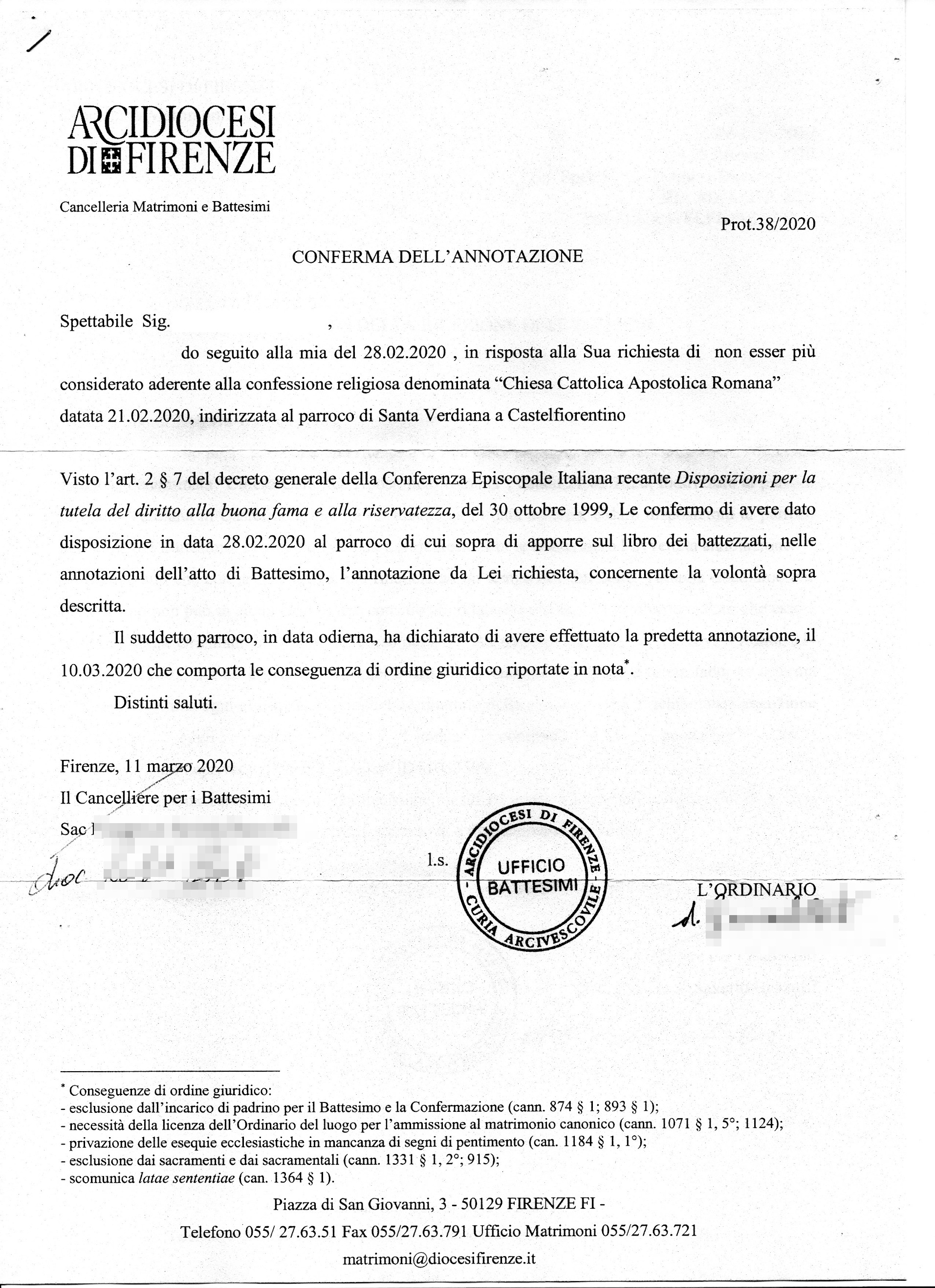 Una persona ha chiesto la rettifica dei dati relativi al proprio battesimo avvenuto a S. Verdiana a Castelfiorentino - CASTELFIORENTINO (FI) il 11/03/2020, dichiarando di non voler più far parte della Chiesa Cattolica.