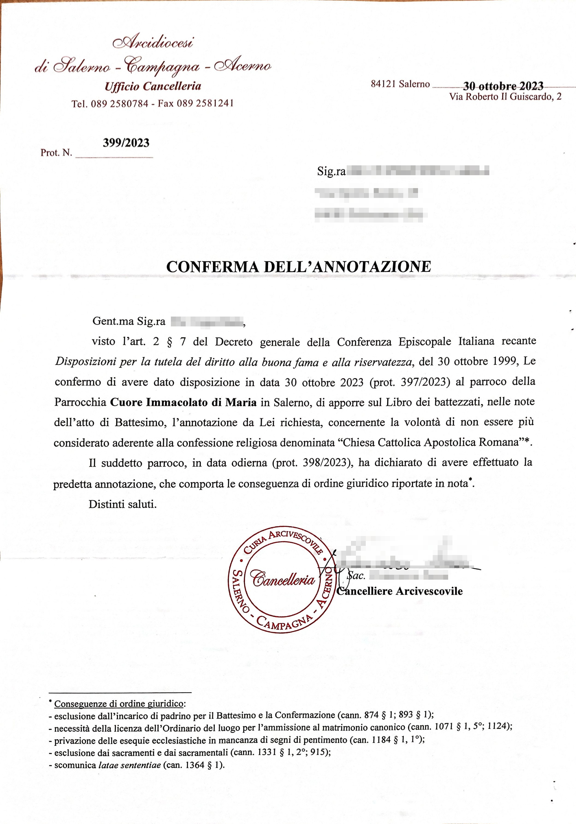 Una persona ha chiesto la rettifica dei dati relativi al proprio battesimo avvenuto a Cuore Immacolato di Maria - SALERNO (SA) il 30/10/2023, dichiarando di non voler più far parte della Chiesa Cattolica.