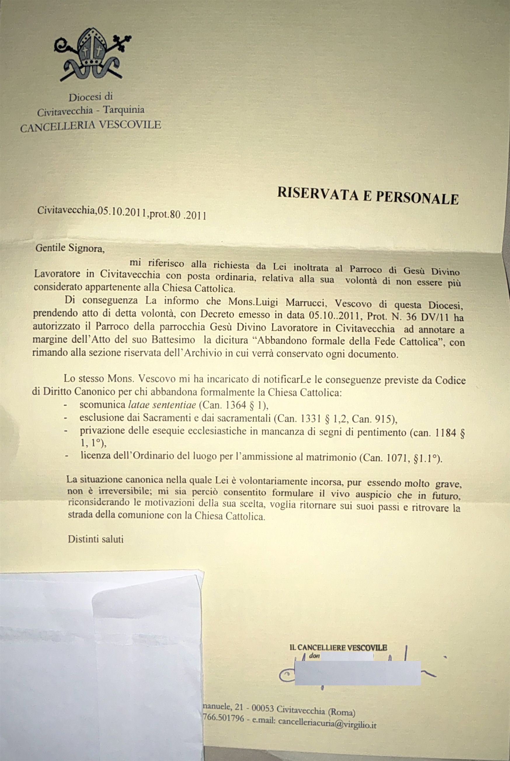 Una persona ha chiesto la rettifica dei dati relativi al proprio battesimo avvenuto a Gesù Divino Lavoratore - CIVITAVECCHIA (RM) il 05/05/2011, dichiarando di non voler più far parte della Chiesa Cattolica.