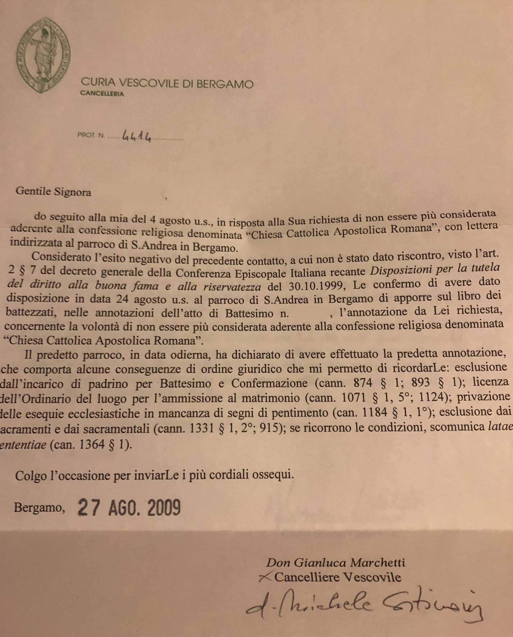 Una persona ha chiesto la rettifica dei dati relativi al proprio battesimo avvenuto a Sant'Andrea - BERGAMO (BG) il 27/08/2009, dichiarando di non voler più far parte della Chiesa Cattolica.