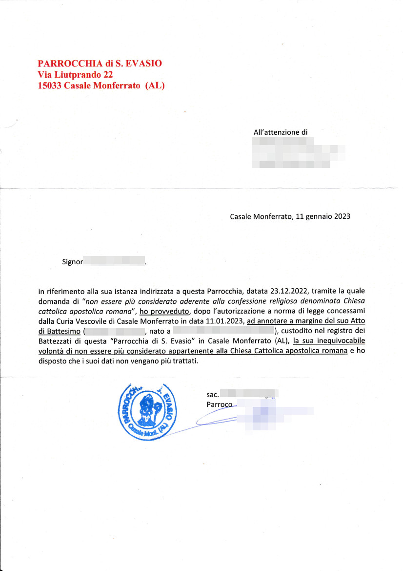 Una persona ha chiesto la rettifica dei dati relativi al proprio battesimo avvenuto a S. Evasio - CASALE MONFERRATO (AL) il 11/01/2023, dichiarando di non voler più far parte della Chiesa Cattolica.