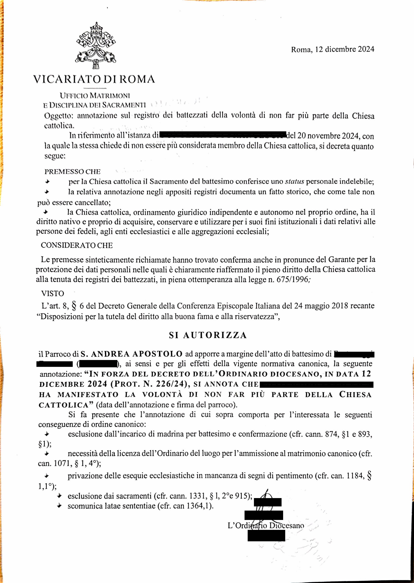 Una persona ha chiesto la rettifica dei dati relativi al proprio battesimo avvenuto a Sant'Andrea Apostolo - ROMA (RM) il 20/12/2024, dichiarando di non voler più far parte della Chiesa Cattolica.