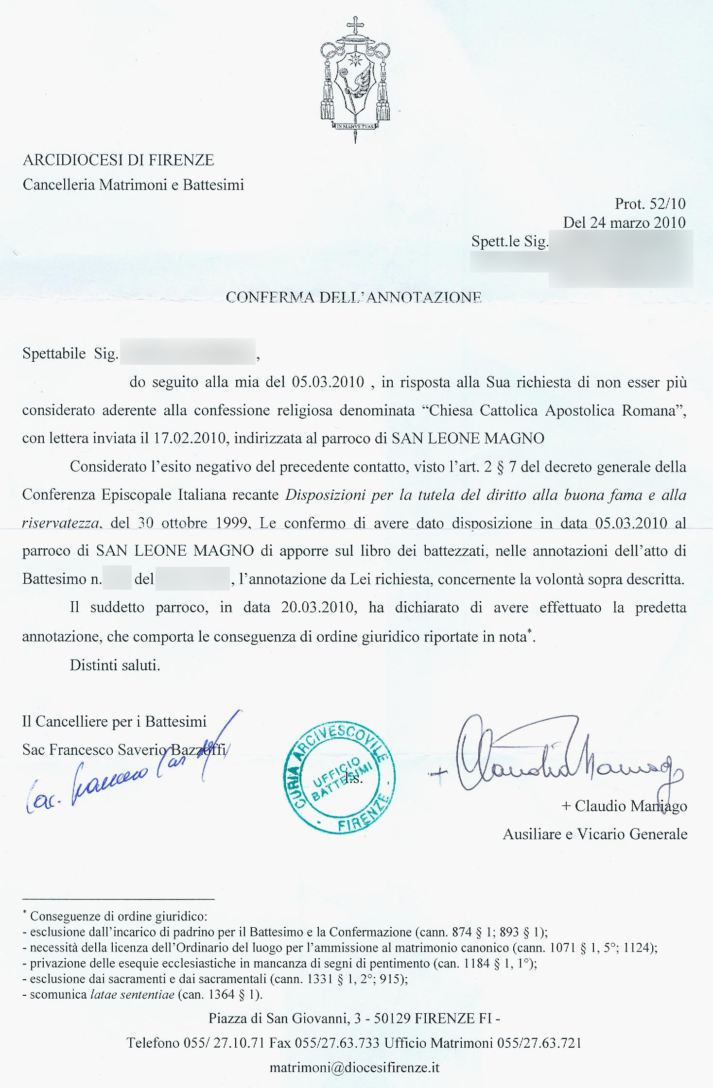Una persona ha chiesto la rettifica dei dati relativi al proprio battesimo avvenuto a S. Leone Magno a Firenze - FIRENZE (FI) il 20/03/2010, dichiarando di non voler più far parte della Chiesa Cattolica.