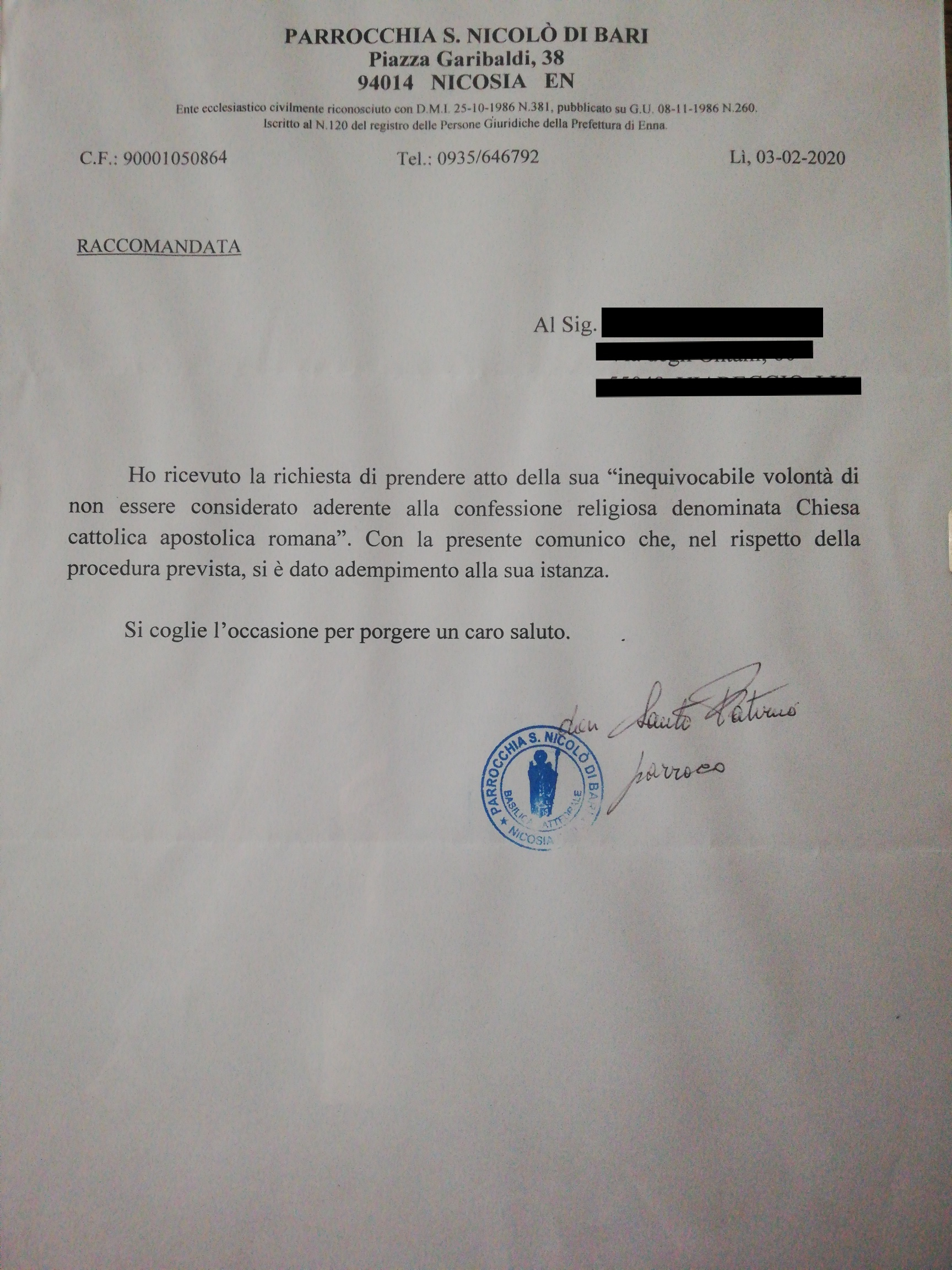Una persona ha chiesto la rettifica dei dati relativi al proprio battesimo avvenuto a S. Nicolò di Bari - NICOSIA (EN) il 03/02/2020, dichiarando di non voler più far parte della Chiesa Cattolica.