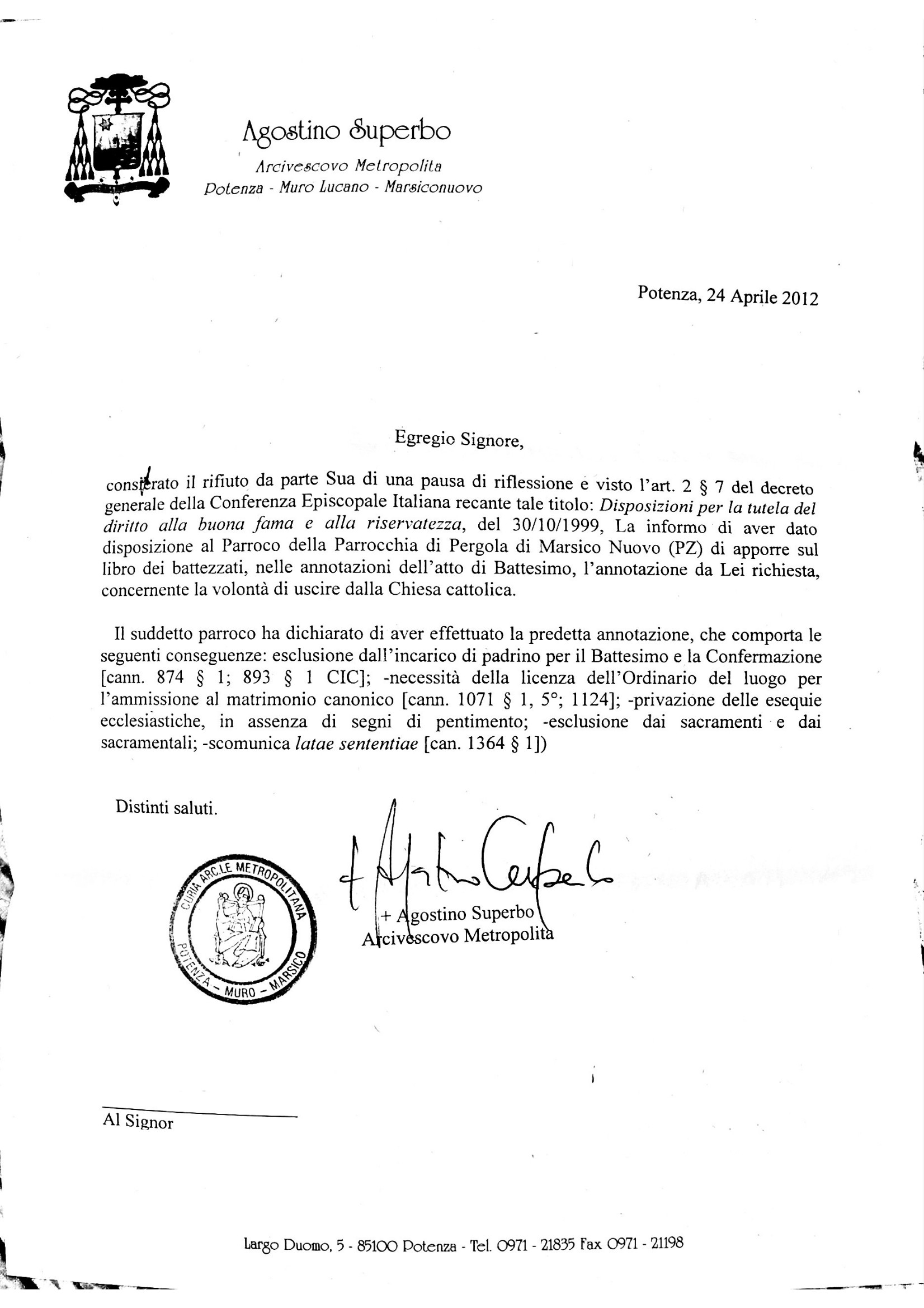 Una persona ha chiesto la rettifica dei dati relativi al proprio battesimo avvenuto a Sacro Cuore Immacolato di Maria - MARSICO NUOVO (PZ) il 24/04/2012, dichiarando di non voler più far parte della Chiesa Cattolica.