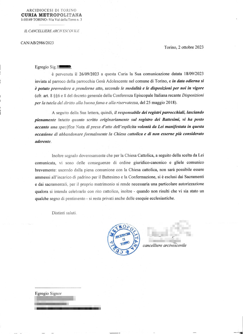 Una persona ha chiesto la rettifica dei dati relativi al proprio battesimo avvenuto a Gesù Adolescente - TORINO (TO) il 02/10/2023, dichiarando di non voler più far parte della Chiesa Cattolica.