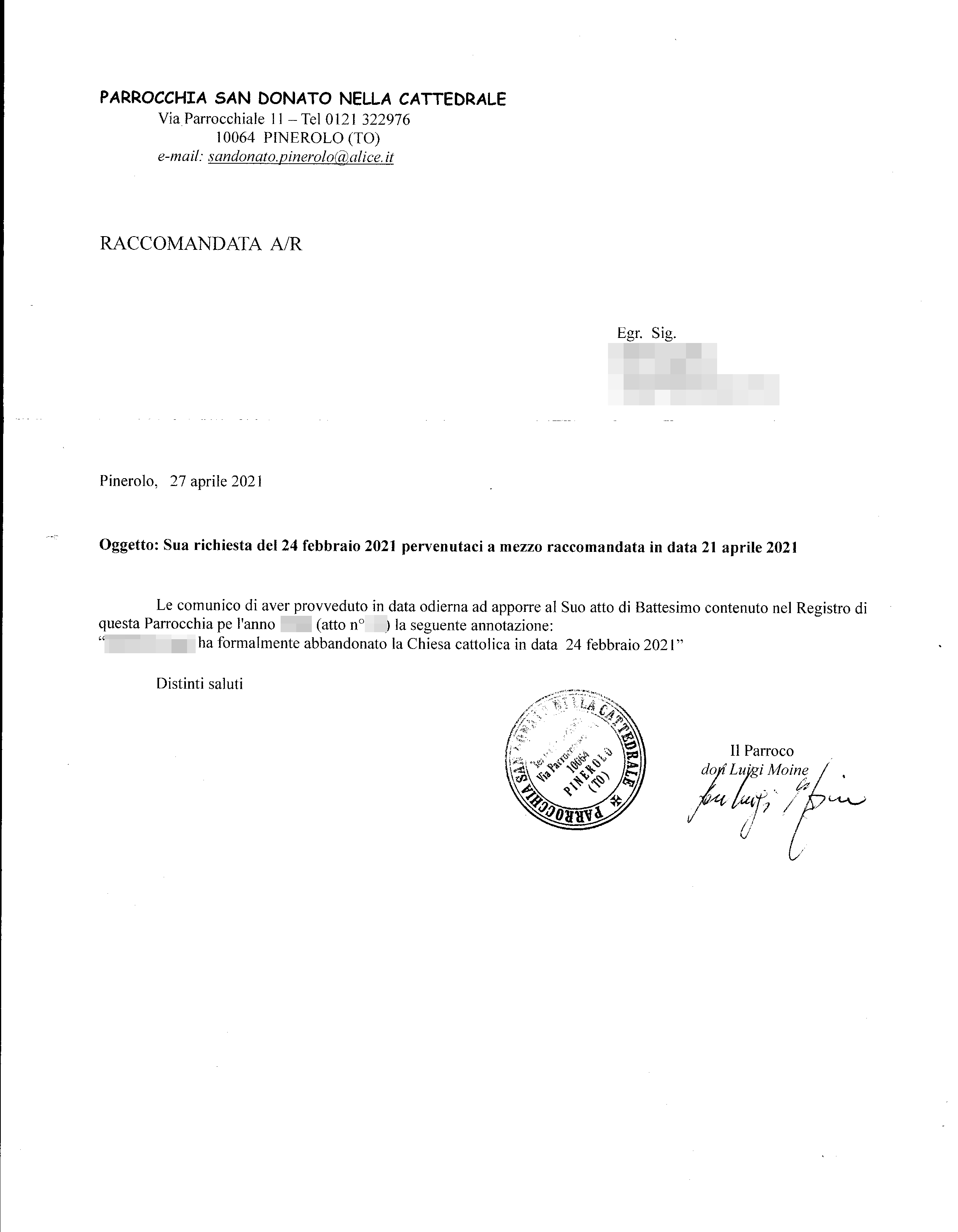 Una persona ha chiesto la rettifica dei dati relativi al proprio battesimo avvenuto a S. Donato nella Cattedrale - PINEROLO (TO) il 27/04/2021, dichiarando di non voler più far parte della Chiesa Cattolica.