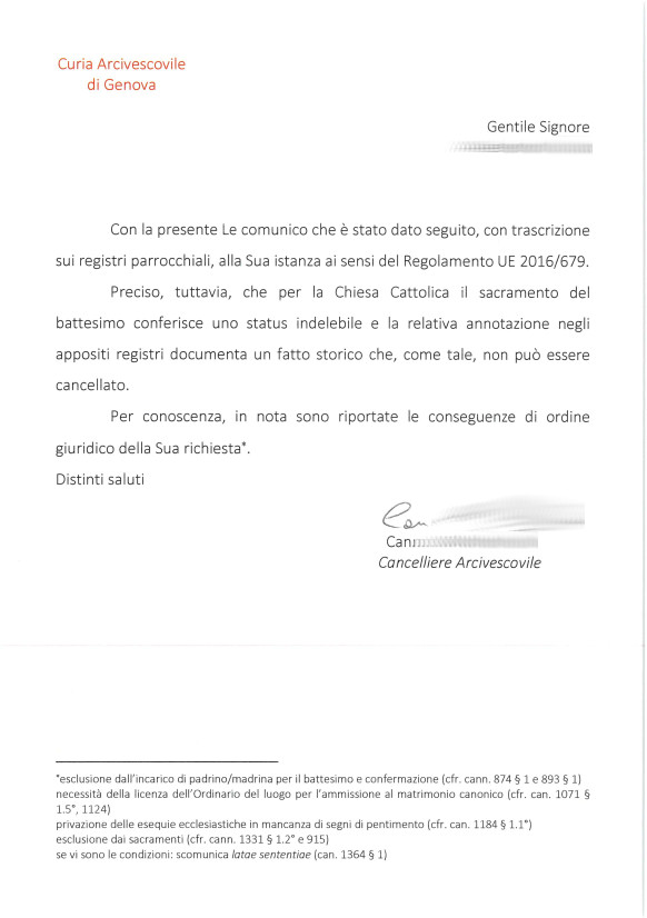 Una persona ha chiesto la rettifica dei dati relativi al proprio battesimo avvenuto a Nostra Signora Assunta - GENOVA (GE) il 02/12/2025, dichiarando di non voler più far parte della Chiesa Cattolica.
