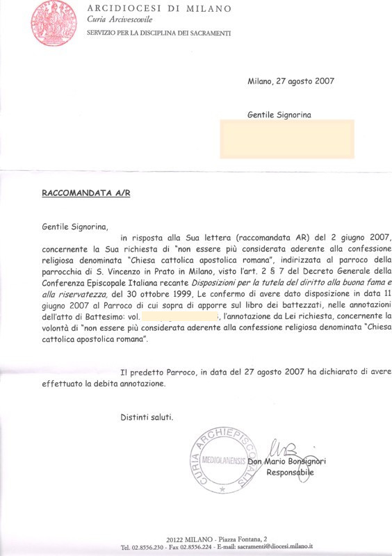 Una persona ha chiesto la rettifica dei dati relativi al proprio battesimo avvenuto a S. Vincenzo in Prato - MILANO (MI) il 27/08/2007, dichiarando di non voler più far parte della Chiesa Cattolica.