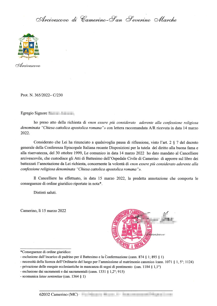 Una persona ha chiesto la rettifica dei dati relativi al proprio battesimo avvenuto a Ospedale Civile - CAMERINO (MC) il 15/03/2022, dichiarando di non voler più far parte della Chiesa Cattolica.