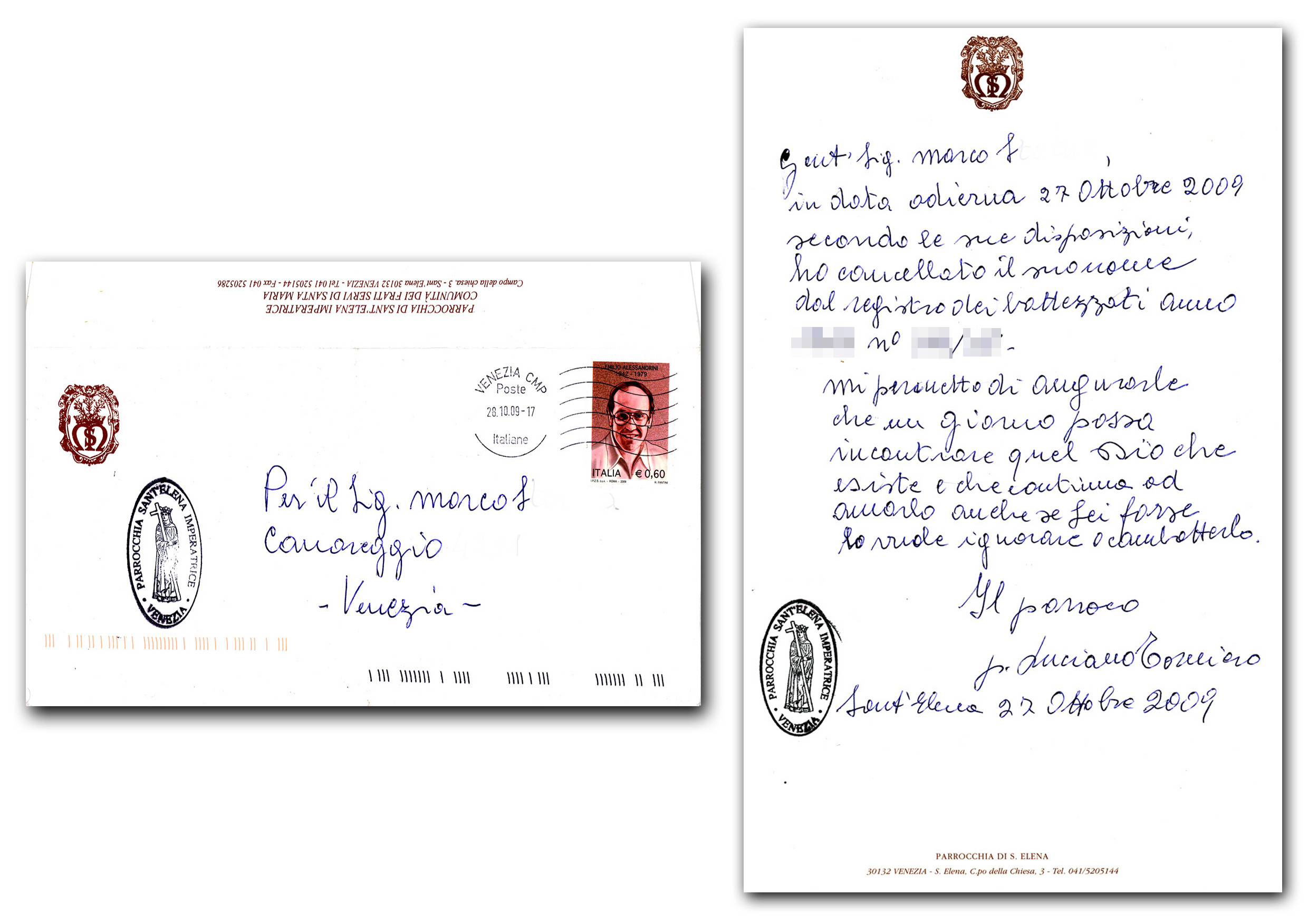 Una persona ha chiesto la rettifica dei dati relativi al proprio battesimo avvenuto a S. Elena Imperatrice - VENEZIA (VE) il 27/10/2009, dichiarando di non voler più far parte della Chiesa Cattolica.