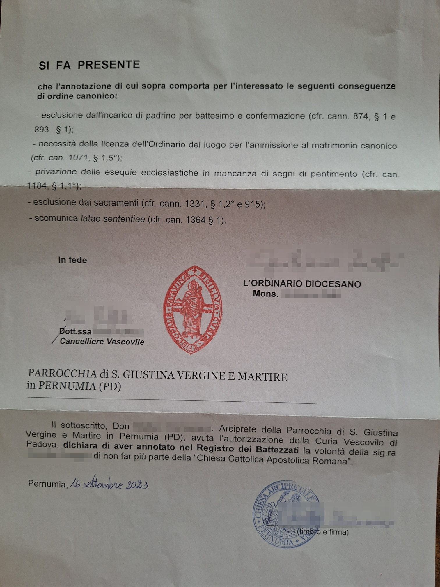 Una persona ha chiesto la rettifica dei dati relativi al proprio battesimo avvenuto a S. Giustina Vergine e Martire - PERNUMIA (PD) il 20/09/2023, dichiarando di non voler più far parte della Chiesa Cattolica.
