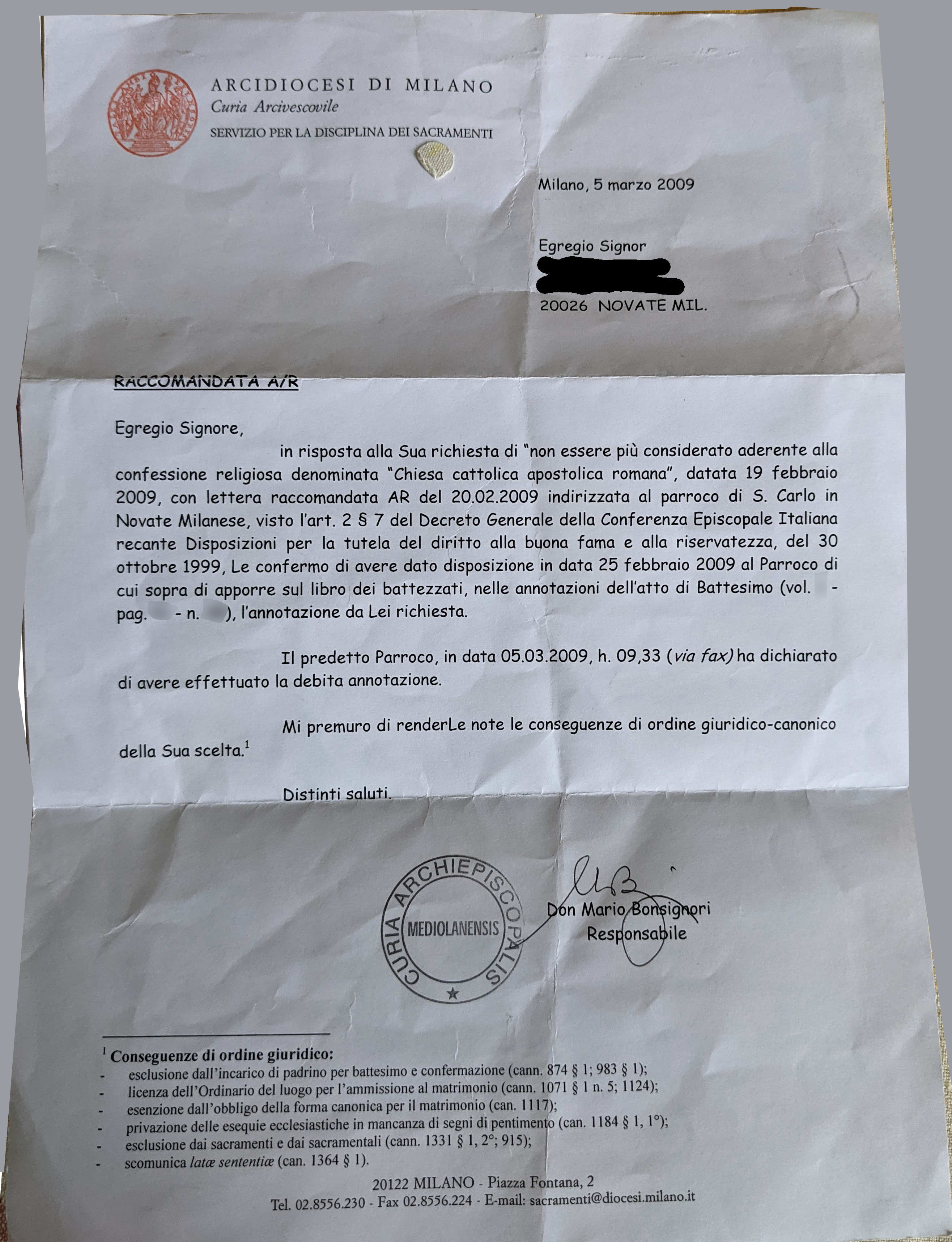 Una persona ha chiesto la rettifica dei dati relativi al proprio battesimo avvenuto a S. Carlo Borromeo - NOVATE MILANESE (MI) il 05/03/2009, dichiarando di non voler più far parte della Chiesa Cattolica.