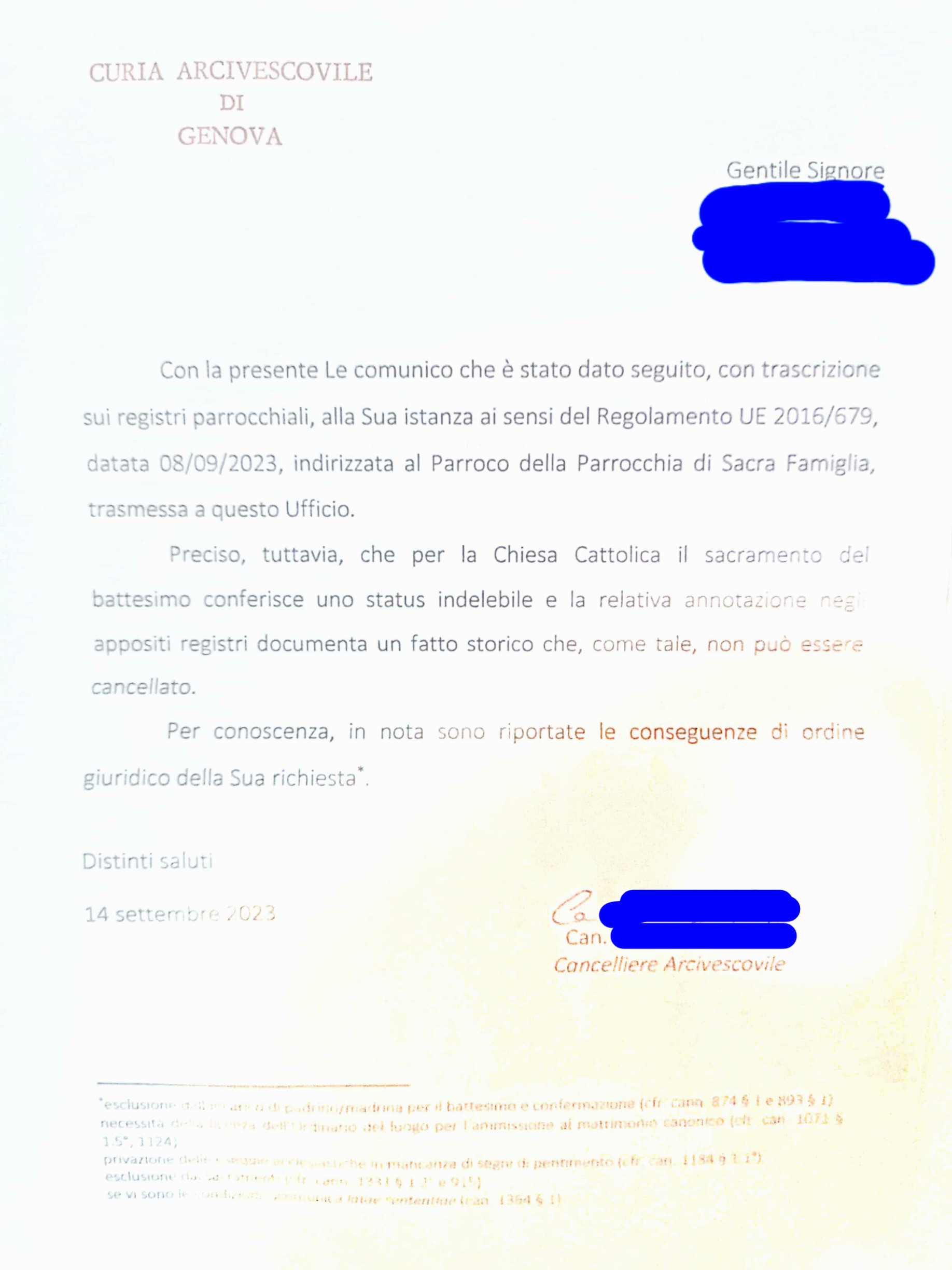 Una persona ha chiesto la rettifica dei dati relativi al proprio battesimo avvenuto a S. Famiglia - GENOVA (GE) il 25/09/2023, dichiarando di non voler più far parte della Chiesa Cattolica.