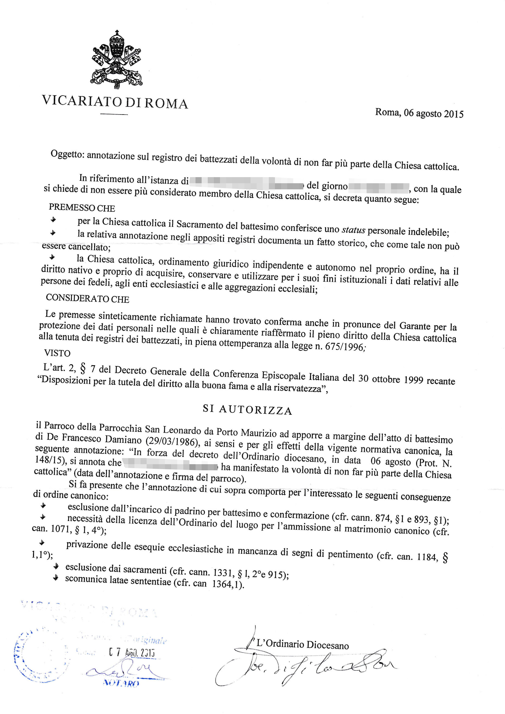 Una persona ha chiesto la rettifica dei dati relativi al proprio battesimo avvenuto a S. Leonardo Da Porto Maurizio - ROMA (RM) il 07/08/2015, dichiarando di non voler più far parte della Chiesa Cattolica.
