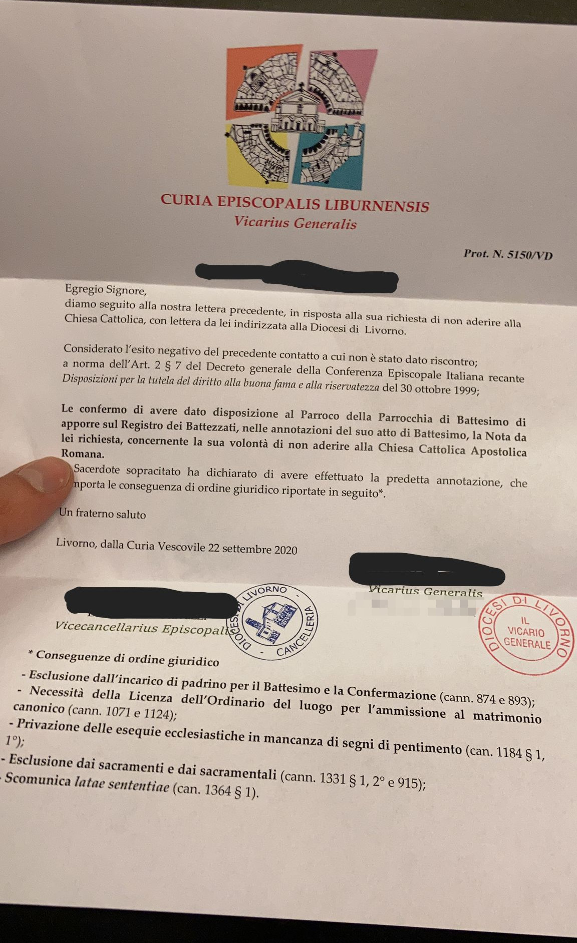 Una persona ha chiesto la rettifica dei dati relativi al proprio battesimo avvenuto a S. Maria di Montenero - LIVORNO (LI) il 22/09/2020, dichiarando di non voler più far parte della Chiesa Cattolica.