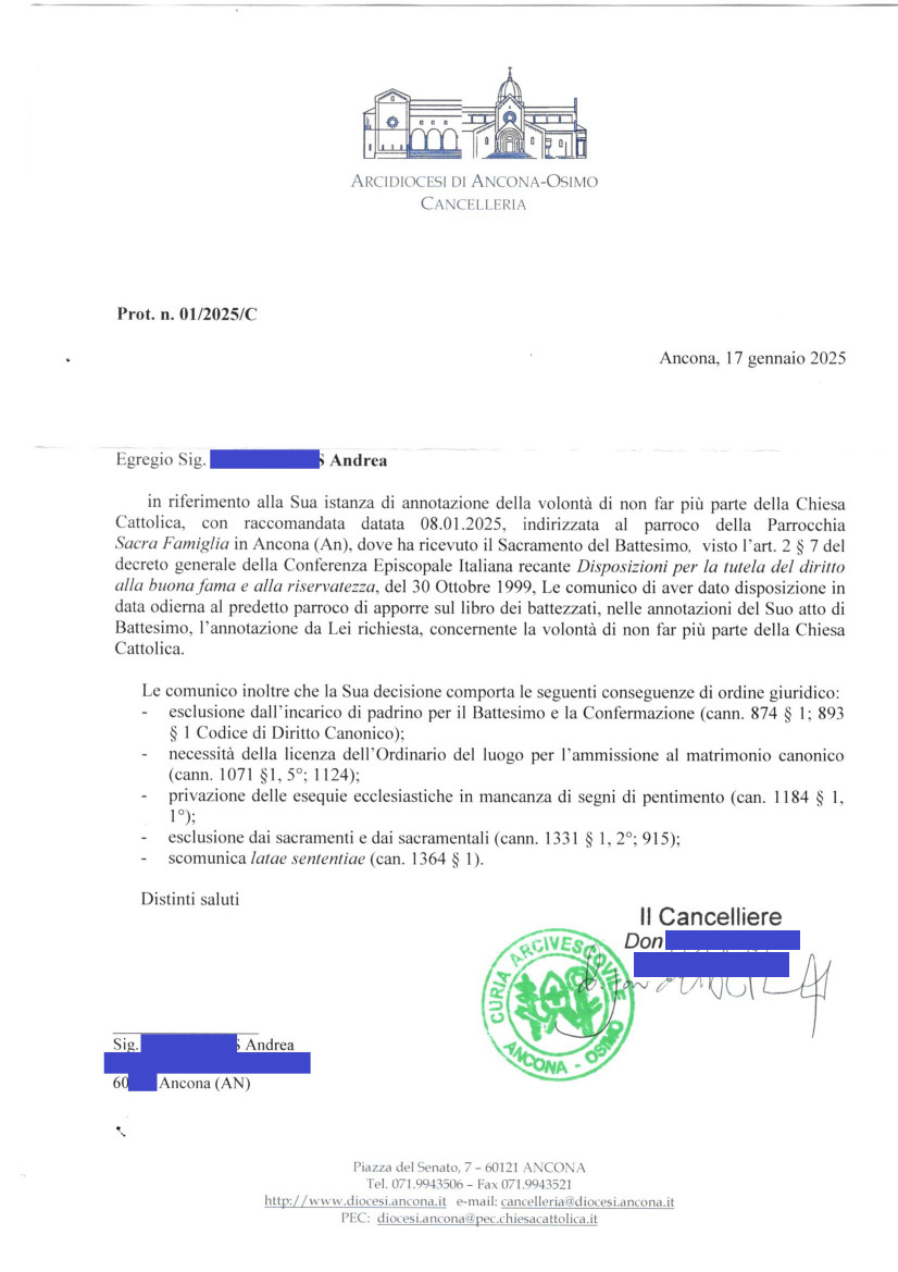 Una persona ha chiesto la rettifica dei dati relativi al proprio battesimo avvenuto a S. Famiglia - ANCONA (AN) il 15/01/2025, dichiarando di non voler più far parte della Chiesa Cattolica.