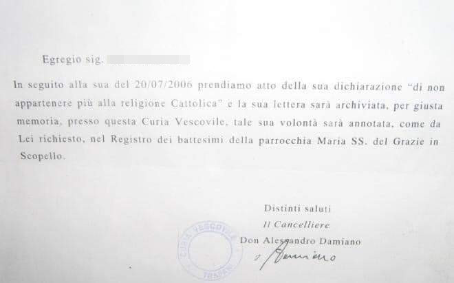Sbattezzato perché in quanto gay non possono chiamarmi abominio e bloccare i diritti civili con il mio tacito consenso. Non mi rappresentano in nessun modo!