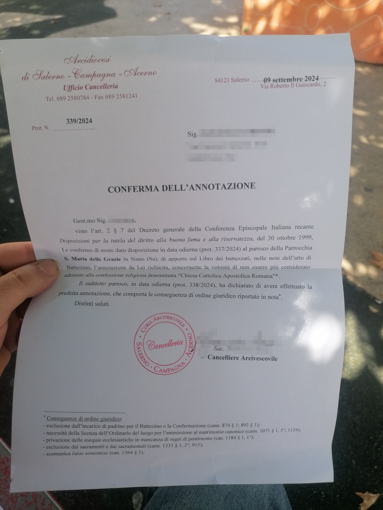 Una persona ha chiesto la rettifica dei dati relativi al proprio battesimo avvenuto a S. Maria delle Grazie - SIANO (SA) il 16/09/2024, dichiarando di non voler più far parte della Chiesa Cattolica.