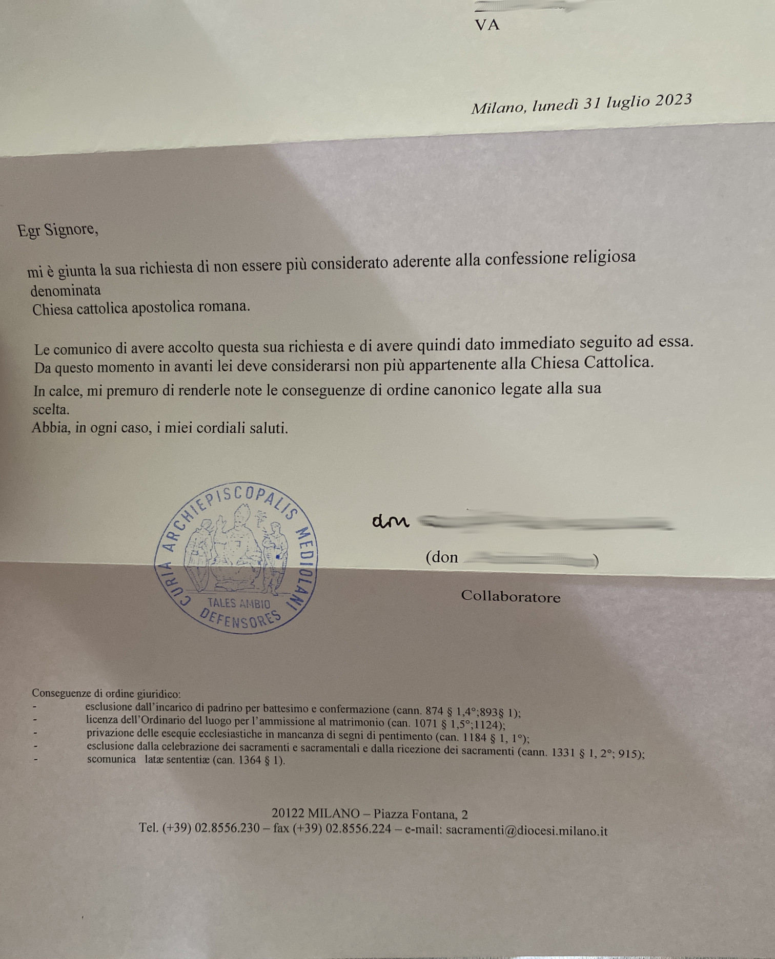 Una persona ha chiesto la rettifica dei dati relativi al proprio battesimo avvenuto a S. Martino - CARNAGO (VA) il 31/07/2023, dichiarando di non voler più far parte della Chiesa Cattolica.