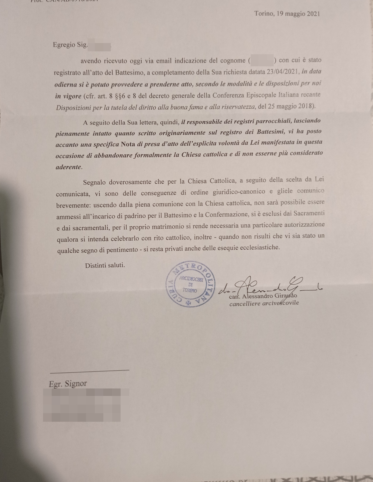 Una persona ha chiesto la rettifica dei dati relativi al proprio battesimo avvenuto a S. Gioacchino - TORINO (TO) il 19/05/2021, dichiarando di non voler più far parte della Chiesa Cattolica.
