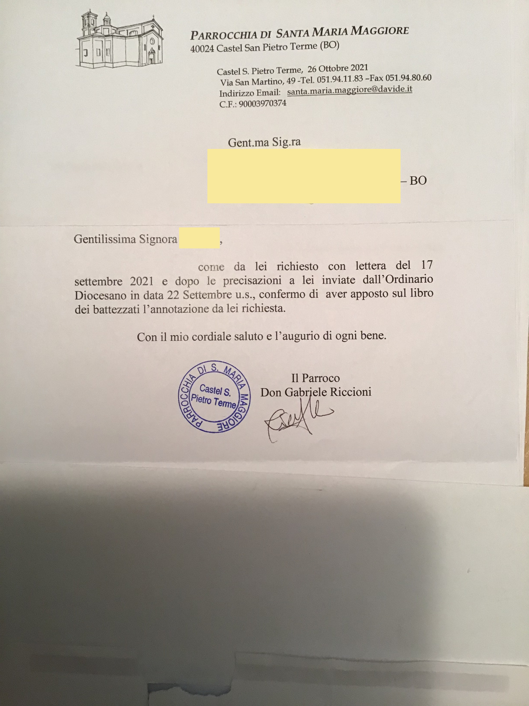 Una persona ha chiesto la rettifica dei dati relativi al proprio battesimo avvenuto a S. Maria Maggiore di Castel S.pietro Terme - CASTEL SAN PIETRO TERME (BO) il 02/11/2021, dichiarando di non voler più far parte della Chiesa Cattolica.