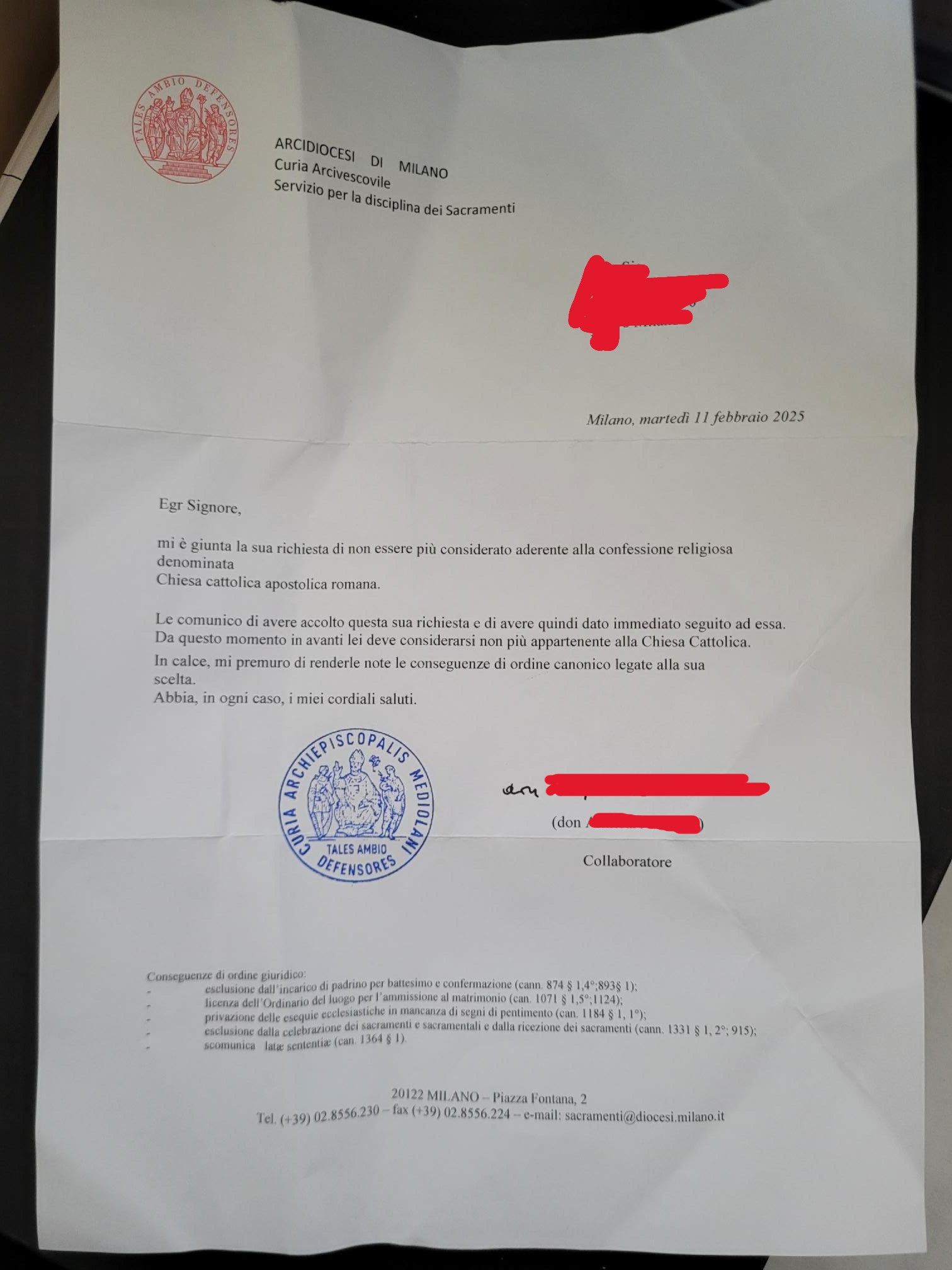 Una persona ha chiesto la rettifica dei dati relativi al proprio battesimo avvenuto a S. Giuseppe Calasanzio - MILANO (MI) il 11/02/2025, dichiarando di non voler più far parte della Chiesa Cattolica.