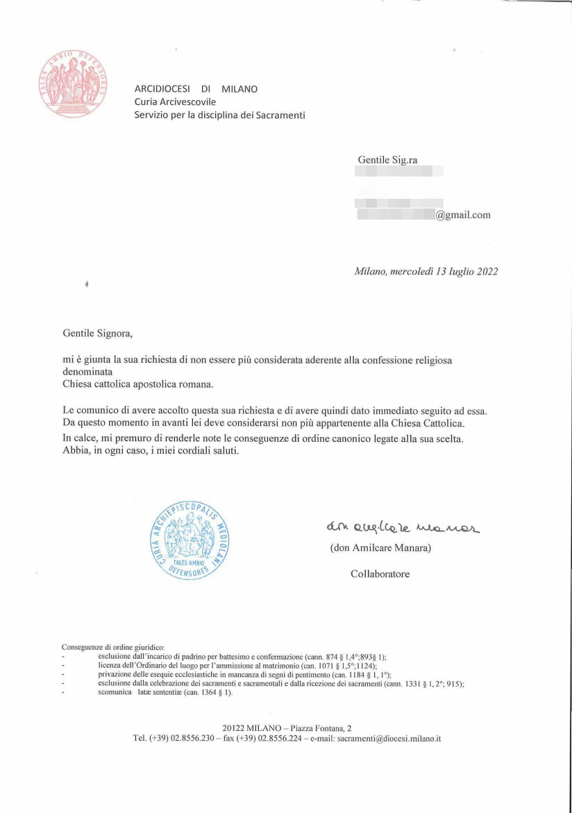 Una persona ha chiesto la rettifica dei dati relativi al proprio battesimo avvenuto a Santi App. Pietro e Paolo - ARLUNO (MI) il 13/07/2022, dichiarando di non voler più far parte della Chiesa Cattolica.