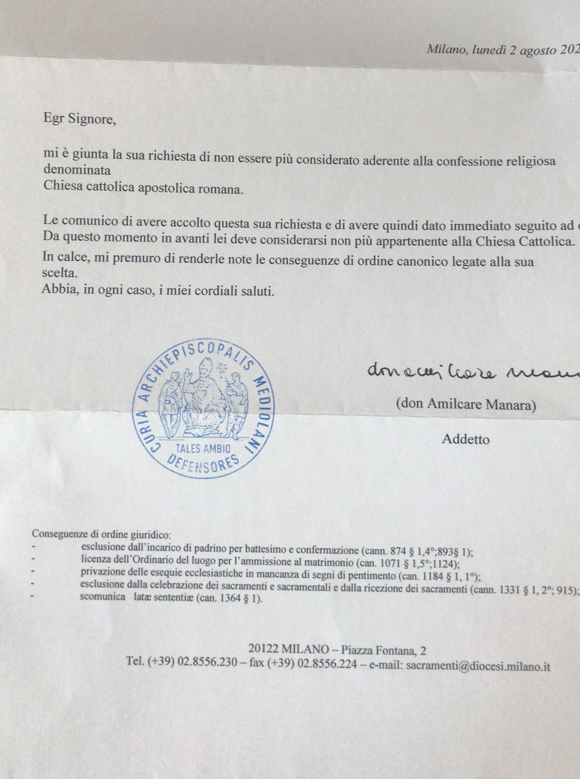 Una persona ha chiesto la rettifica dei dati relativi al proprio battesimo avvenuto a Ss. Redentore - MILANO (MI) il 02/08/2021, dichiarando di non voler più far parte della Chiesa Cattolica.