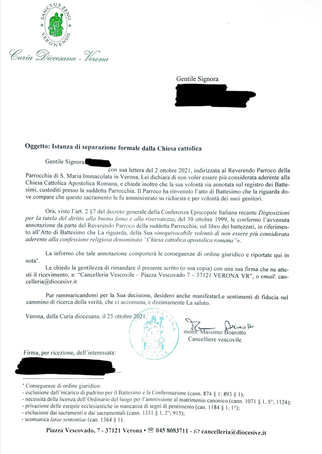 Una persona ha chiesto la rettifica dei dati relativi al proprio battesimo avvenuto a Maria Immacolata - VERONA (VR) il 25/10/2021, dichiarando di non voler più far parte della Chiesa Cattolica.