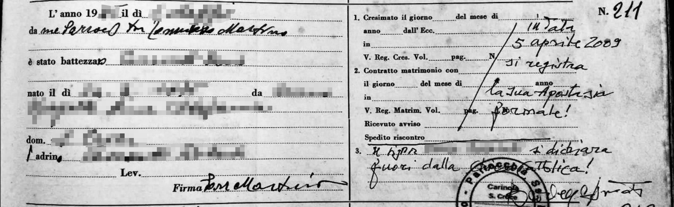 Ho dovuto inviare una mail di sollecito a distanza di ben undici anni, solo per scoprire che l’annotazione era stata apposta in tempi rapidi dopo la ricezione della comunicazione di apostasia formale. Il divertimento è stato che l’annotazione reca un punto esclamativo, a metà tra lo stupore e lo sdegno.