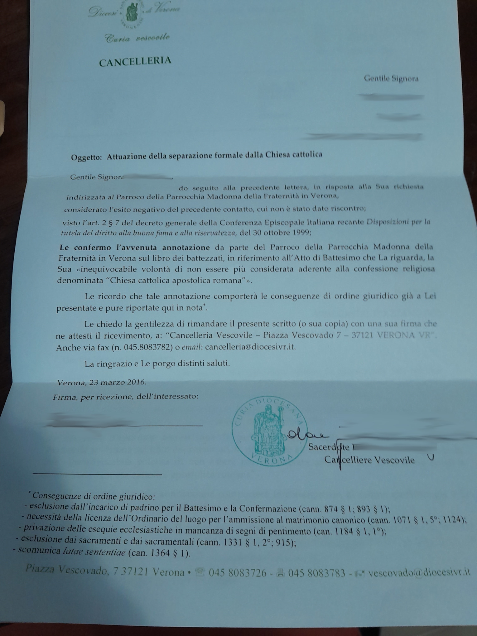 Una persona ha chiesto la rettifica dei dati relativi al proprio battesimo avvenuto a Madonna della Fraternità - VERONA (VR) il 23/03/2016, dichiarando di non voler più far parte della Chiesa Cattolica.