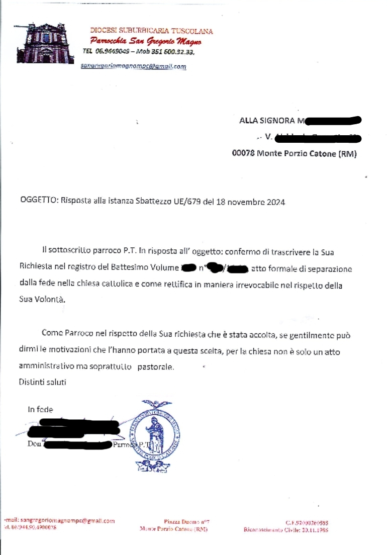 Una persona ha chiesto la rettifica dei dati relativi al proprio battesimo avvenuto a S. Gregorio Magno - MONTE PORZIO CATONE (RM) il 21/11/2024, dichiarando di non voler più far parte della Chiesa Cattolica.