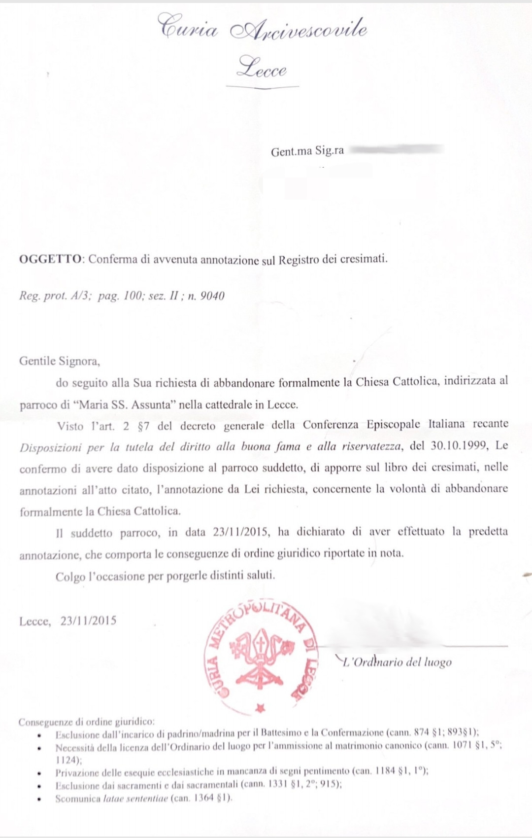 Una persona ha chiesto la rettifica dei dati relativi al proprio battesimo avvenuto a Maria Ss. Assunta - LECCE (LE) il 23/11/2014, dichiarando di non voler più far parte della Chiesa Cattolica.