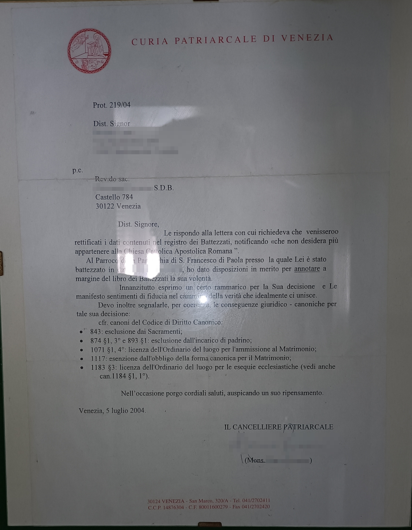 Una persona ha chiesto la rettifica dei dati relativi al proprio battesimo avvenuto a S. Francesco di Paola - VENEZIA (VE) il 10/08/2004, dichiarando di non voler più far parte della Chiesa Cattolica.