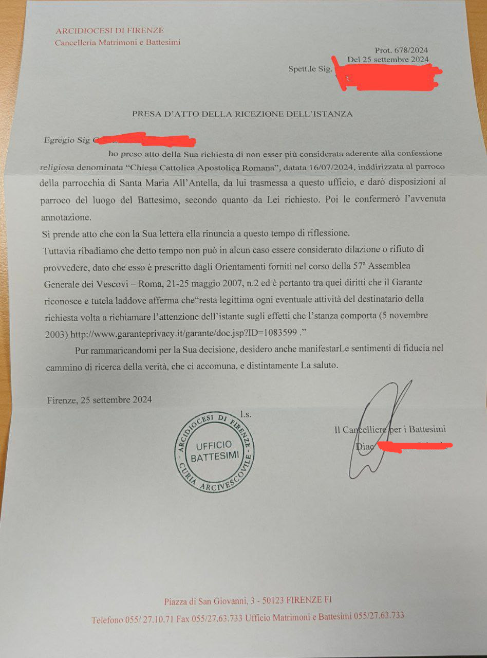 Una persona ha chiesto la rettifica dei dati relativi al proprio battesimo avvenuto a S. Maria all'Antella - BAGNO A RIPOLI (FI) il 25/09/2024, dichiarando di non voler più far parte della Chiesa Cattolica.